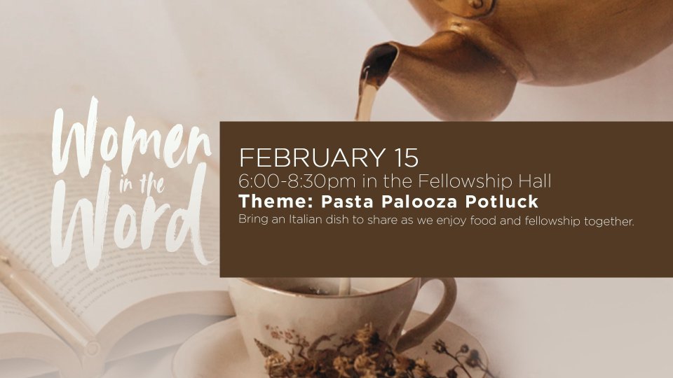 Women are invited to join us for Women in the Word on Sunday, February 15, from 6:00–8:30 PM in the Fellowship Hall. Our theme for the evening is Pasta Palooza Potluck, so please bring an Italian dish to share as we enjoy food and fellowship together. During the evening, we will worship together and hear an encouraging message from guest speaker Nick Akin, who will be joined by his wife and children as they sing and share. They will tell the powerful story of adopting their daughter and how God has faithfully carried their family through many health challenges, pointing to the beautiful truth that we are all adopted into God’s family. We will also enjoy meaningful table conversations in this relaxed and uplifting evening. Whether you are new or have attended before, we would love for you to come hungry, bring a friend, and join us!