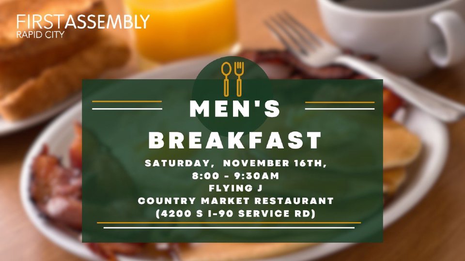 The Men’s Breakfast is Saturday, November 16th, starting at 8:00am, at Flying J Country Market Restaurant (4200 N I-90 Service Rd Ext 61). Carter Smith will be our guest speaker. All men are welcome to attend.
