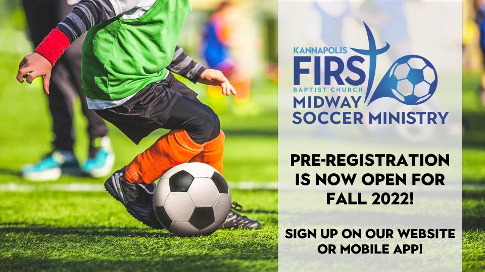 First Baptist Church is excited to announce Midway Soccer's season 13! Our pre-registration is now open for all four year-olds through fourth graders for soccer this Fall. You can fill out your complete pre-registration here (next to the "complete this form" link) and pre-pay if you'd like (next to the "register" link).