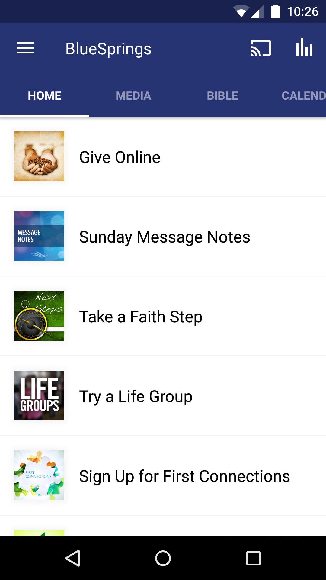 The official First Baptist Church Blue Springs App The community gathered at FBC Blue Springs exists to Know Christ and Make Christ Known. This App is your central hub for our media content and digital connections. After you've downloaded and enjoyed the content, you can share it with your friends via Twitter, Facebook, or email. Features of this app: - Listen to or watch weekly messages - Dive into the Bible through our church wide reading plan - Stay up to date on upcoming opportunities - Connections to next steps of obedience and faith - Follow FBC Blue Springs on Facebook, Twitter and the Web For more information about First Baptist Church of Blue Springs, please visit: http://www.fbcbluesprings.org NOTE: WiFi internet is required for Touch and non-3G users. The FBC Blue Springs app was developed with The Church App by Subsplash.