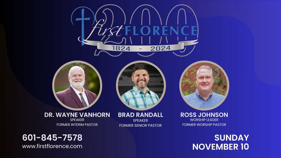 Join us as we celebrate the 200th Anniversary of First Baptist Florence. We will have guest speakers, Dr. Wayne VanHorn & Brad Randall, along with Worship Leader, Ross Johnson. We will have a meal following the morning worship.