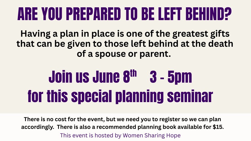 Please join us for this special event designed to shed light on the necessity of planning for life’s inevitable conclusion. You will hear from estate planning attorney, Travis Weaver; a panel of widows who will share what they have learned; and Pastor Kim on the most important part, our spiritual preparation.