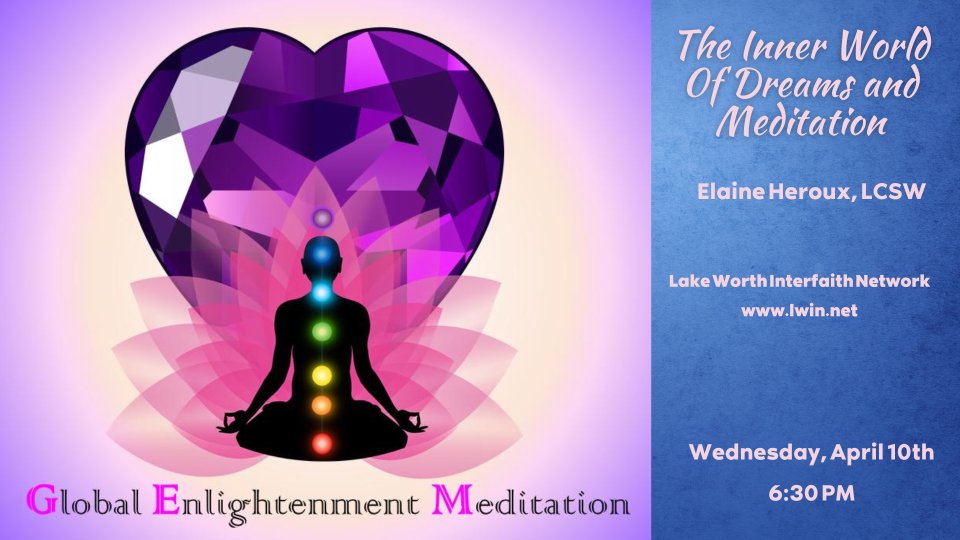 Global Enlightenment Meditation is presented by Lake Worth Interfaith Network. Each week, a short teaching is presented followed by a meditation. This week, Elaine Heroux, LCSW, will be presenting on The Inner World of Dreams and Meditation. The Zoom password is "rainbow".
