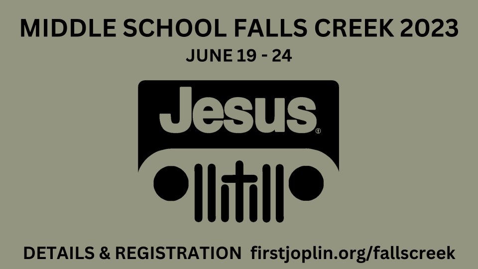 This will be one of the Greatest Weeks of your entire life!! Falls Creek is the largest Youth Camp in the Nation with one of the largest ropes courses in North America, a high end skate park, swimming in the creeks and lake, volleyball, Frisbee golf, and so much more. Falls Creek is like no other camp you have ever experienced. The week of June 19-24. Registration is open to Students coming out of grades 6 - 8. Band: Robertson Speaker: Tom Richter The cost is $275 per student. The earlybird rate is $235 (deadline to pay the deposit to receive the earlybird rate is March 8th). This covers EVERYTHING: travel, lodging, food, registration, materials, activities, and a t-shirt. A $50 deposit reserves your spot. After June 1st the price goes up to $295. Contact the Church Office (churchoffice@firstjoplin.org) or Jason (jason@firstjoplin.org) for more info.