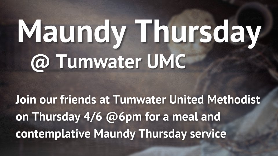 Come join us over in Tumwater where we'll be observing a contemplative Maundy Thursday with other churches in the South Sound co-op at Tumwater United Methodist Church. We'll begin worship at 6pm.