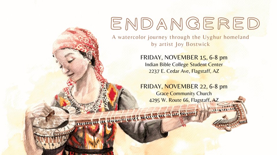Joy Bostwick will exhibit over 100 beautiful watercolor paintings. Her work is aimed at showing the world what is being lost in the ongoing atrocities against the Uyghur people of Northwest China. Come ready to celebrate this unique culture and have your compassion and awareness deepened for what is one of the greatest tragedies of the 21st century.