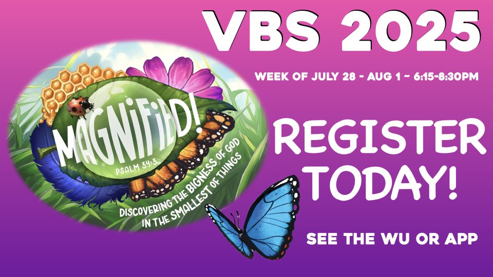 Magnified! VBS will encourage kids to look closely at the details of God’s amazing world and magnify, or proclaim, the greatness of God. God made us, cares about us, loves us, forgives us, and is faithful to keep all His promises to us. We can praise God together! We were made to magnify God!