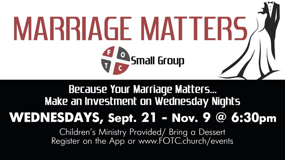 FOTC kicks off the new small group - Marriage Matters - because your marriage MATTERS! Make an investment on Wednesday Nights! Bring a dessert!