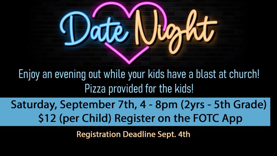 Enjoy an evening out while your kids have a blast at church! Pizza provided for the kids!