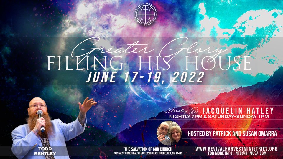 The Salvation of God Church Greater Glory Filling His House "Rochester NY" June 17th-19th 2022 7 pm Nighty Todd Bentley will be speaking Saturday, June 18th 1 pm Patrick and Susan will be Speaking Jacquelin Hatley will be doing the worship Located: 333 West St. Suite 2000 East Rochester, NY. 14445