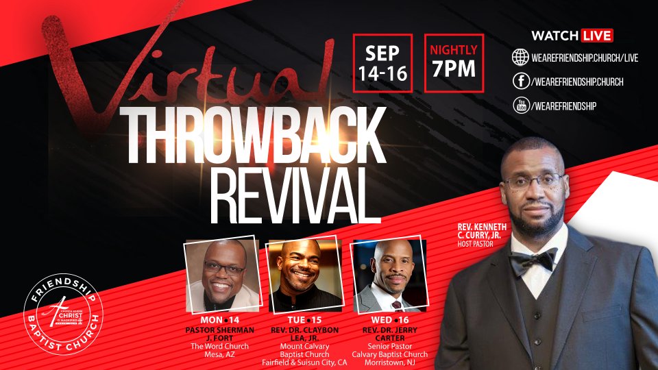 Revival 2020 is coming! This year’s revival is a Virtual Throwback Revival and will take place Monday, September 14th through Wednesday, September 16th, at 7pm and will feature past messages from: Pastor Sherman Fort of the Word Church in Mesa, AZ Rev. Dr. Claybon Lea, Jr. Pastor of Mt. Calvary Baptist Church of Fairfield, CA Rev. Dr. Jerry Carter, Jr. of Calvary Baptist Church of Morristown, NJ Don't miss it.