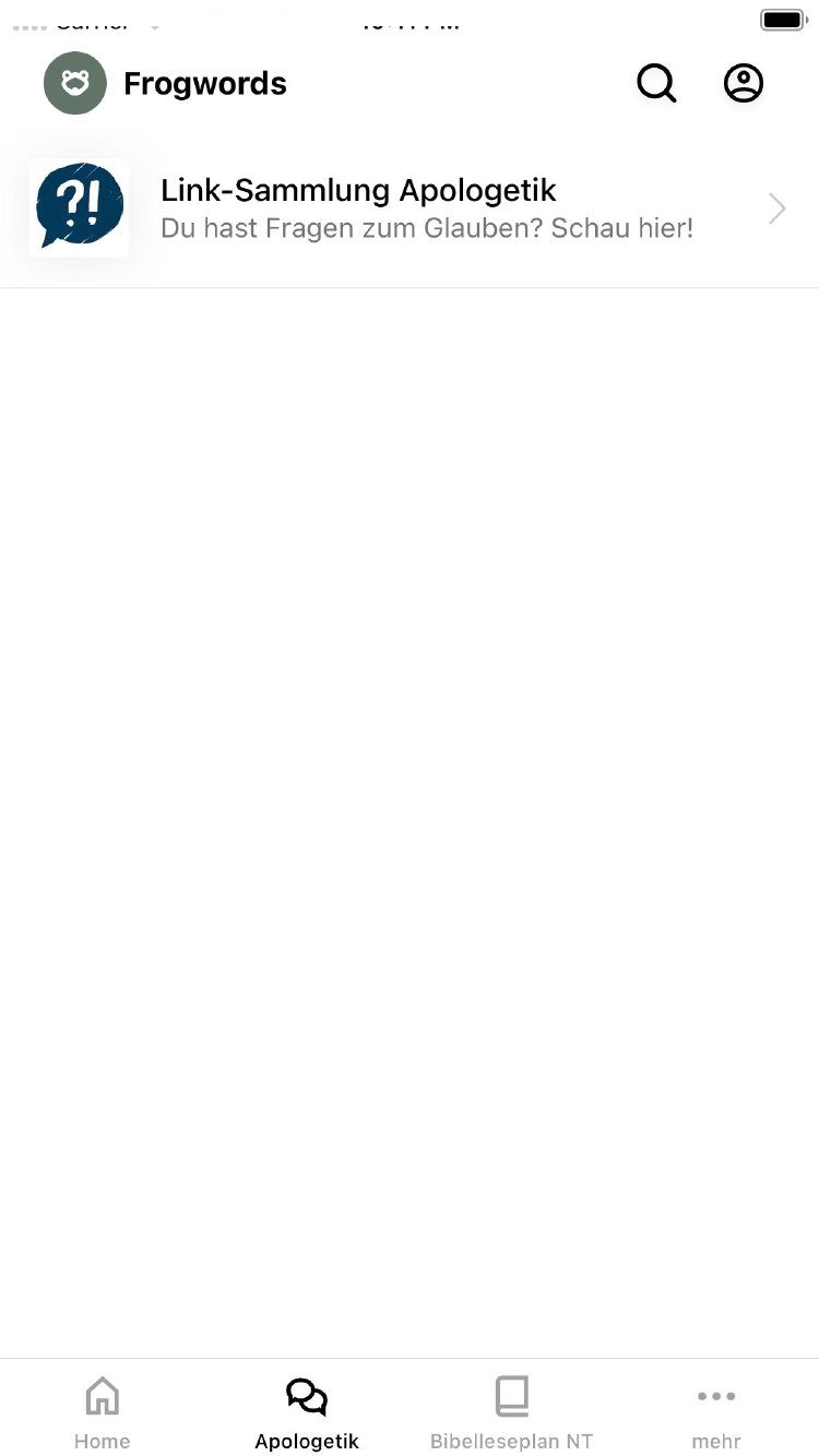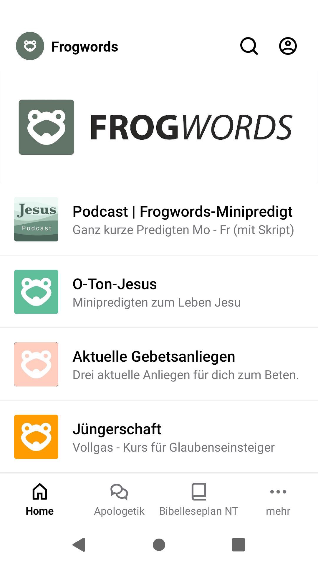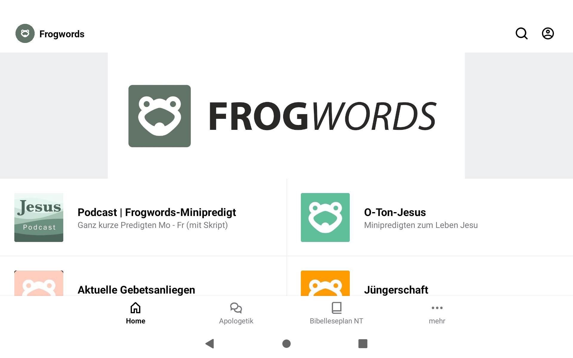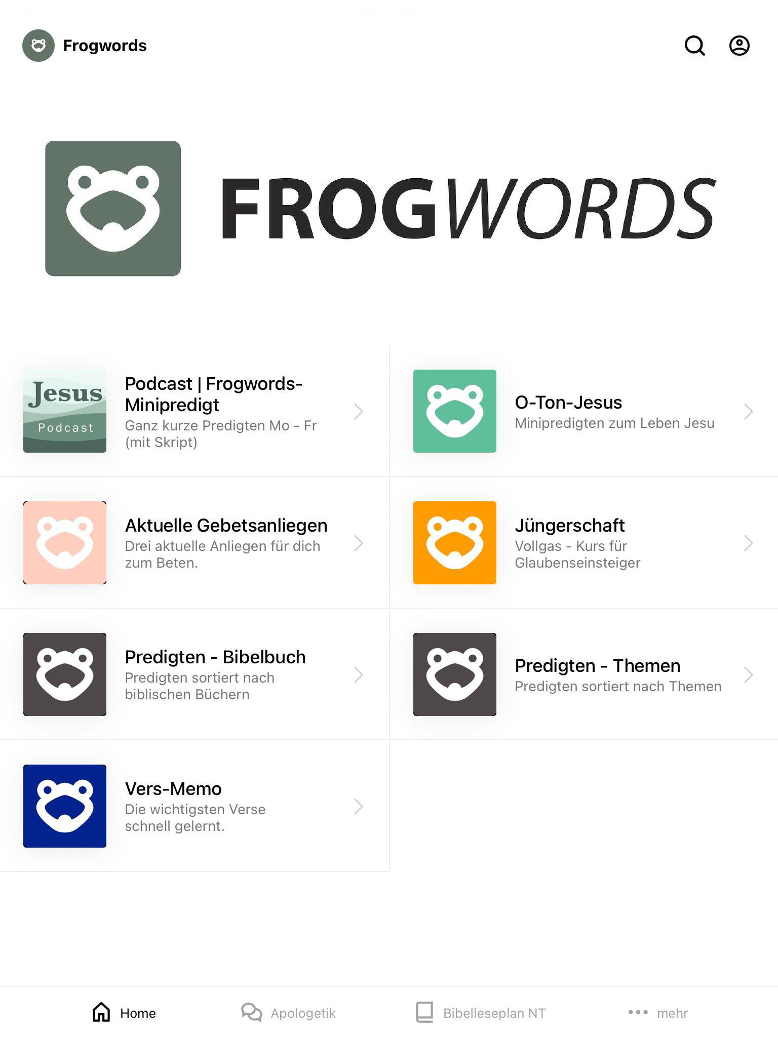 Mit der kostenlosen FROGWORDS App kannst du jederzeit bequem auf die Predigten von Jürgen Fischer zugreifen. Im Angebot sind einzelne Predigten und Predigtreihen, kurze tägliche Impulse, Online-Bibelstunden und ganz aktuell ein Gang durch das Leben und die Lehre Jesu. Folgende Funktionen bietet dir die FROGWORDS App: - Zugriff auf alle Inhalte der FROGWORDS Mediathek - Predigten sortiert nach biblischen Büchern und Themen - tägliche (Mo-Fr) Impulse für dein Glaubensleben - einen Jüngerschaftskurs für junge Glaubenseinsteiger - Tipps und Tricks zum Auswendiglernen von Bibelversen - Download der Inhalte - Livestream Mit der „Weiterleiten“-Funktion können Sie einzelne Sendungen gezielt in den Sozialen Netzwerken, per E-Mail o.a. mit Familie, Freunden und Bekannten teilen