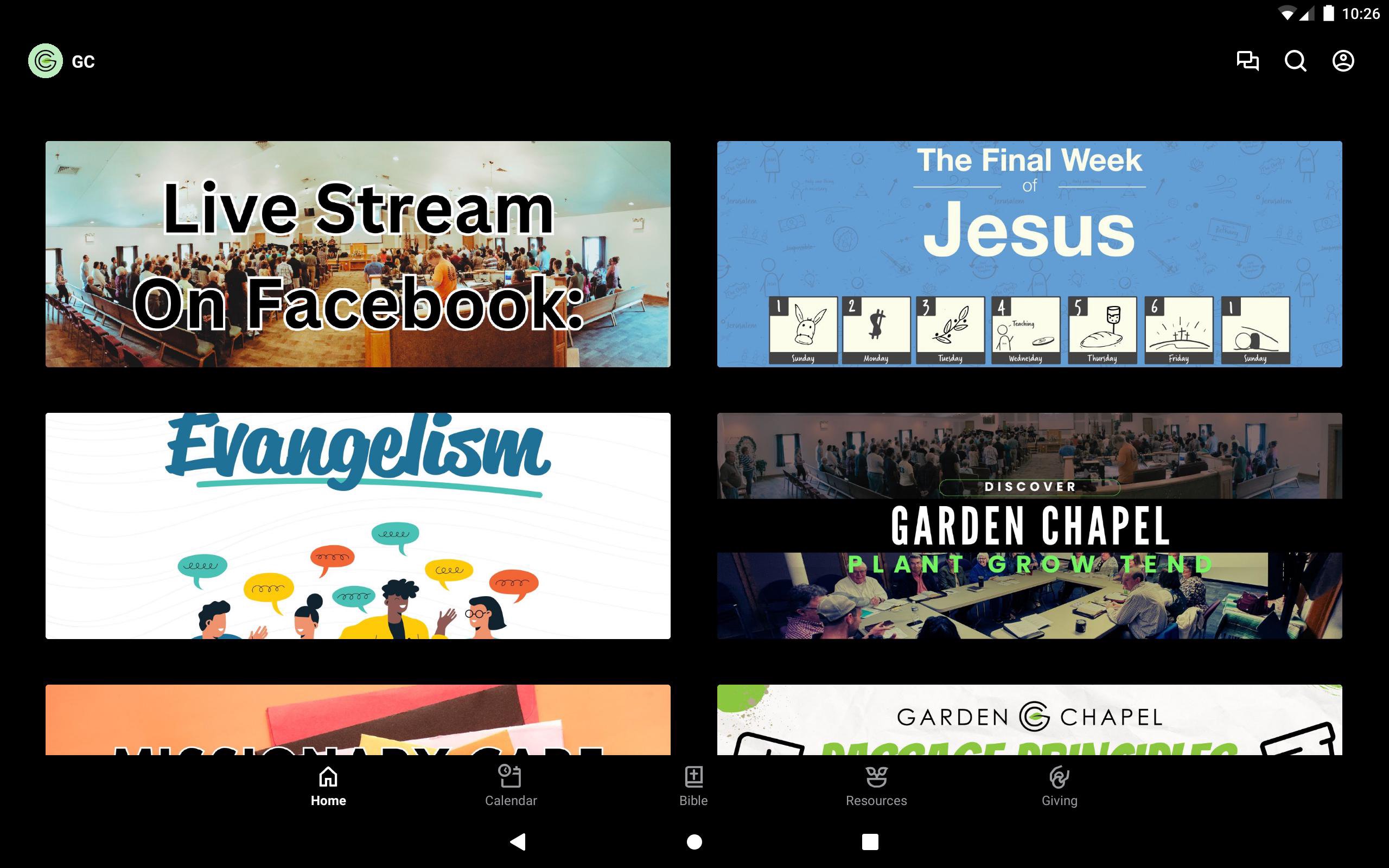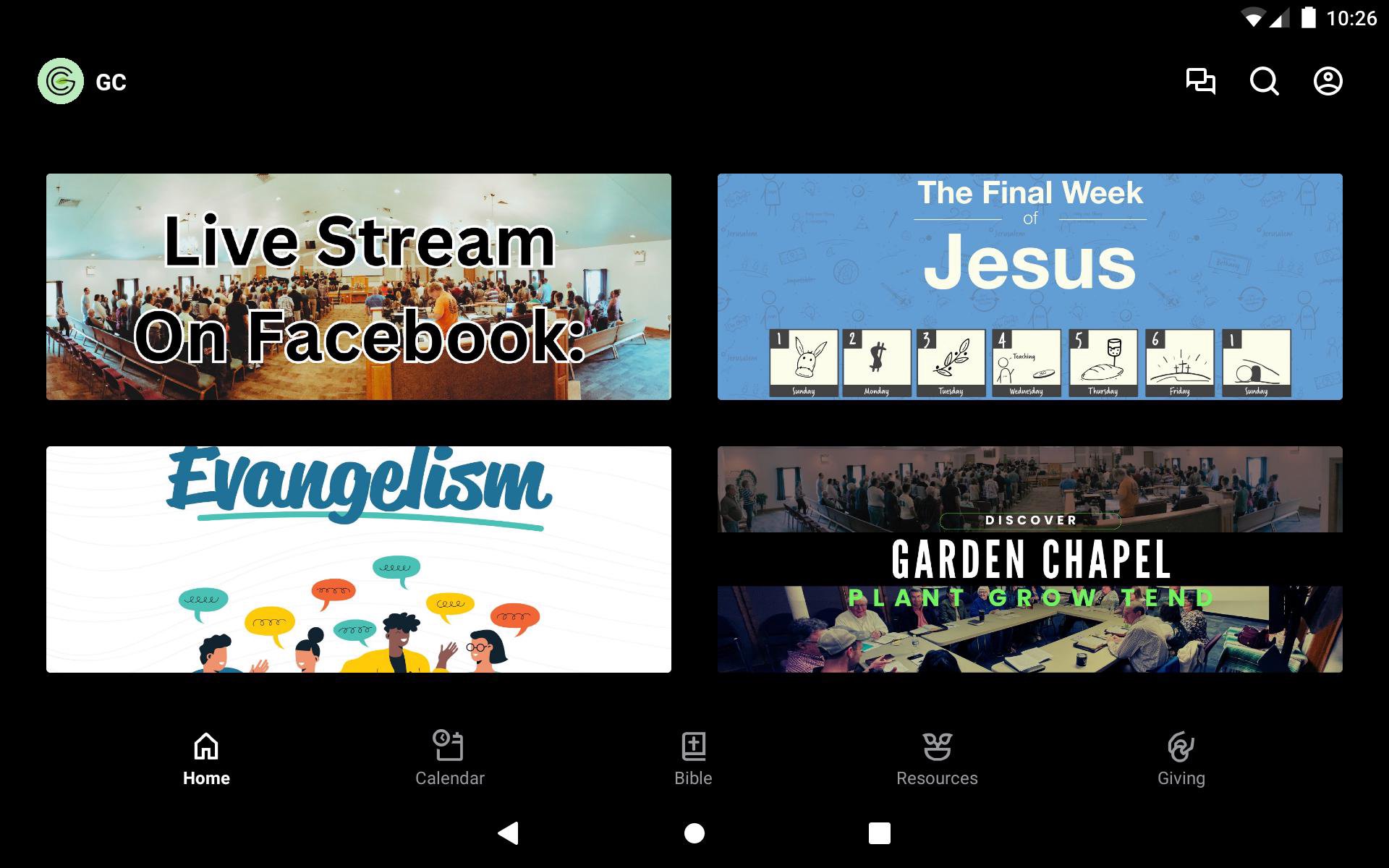 Welcome to the Garden Chapel app! Stay connected, like never before. This app is designed to help us with online sign-ups, live streaming, sermon notes, daily devotionals, and more. Be sure to check out all of our GC Studio content too!
