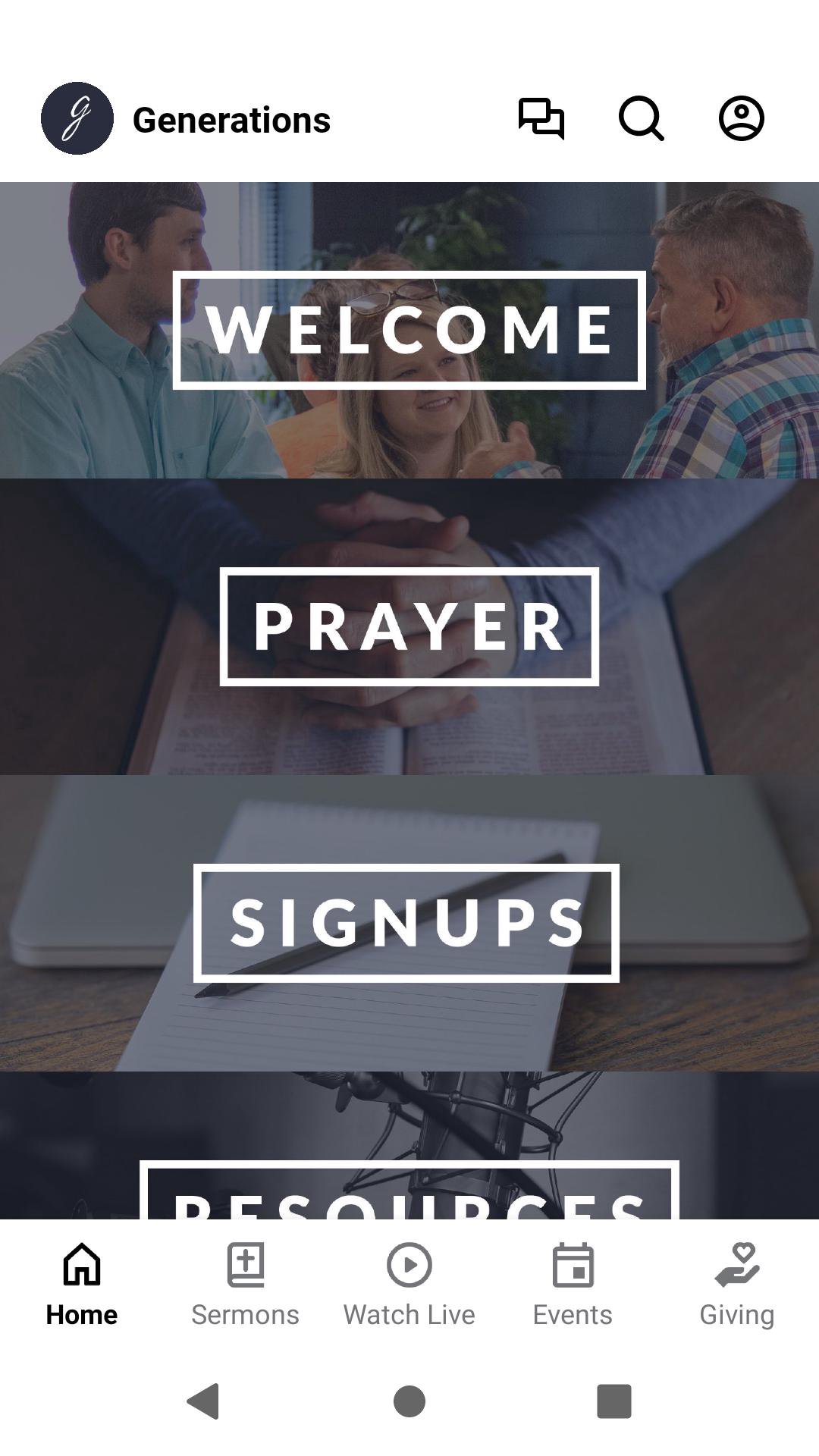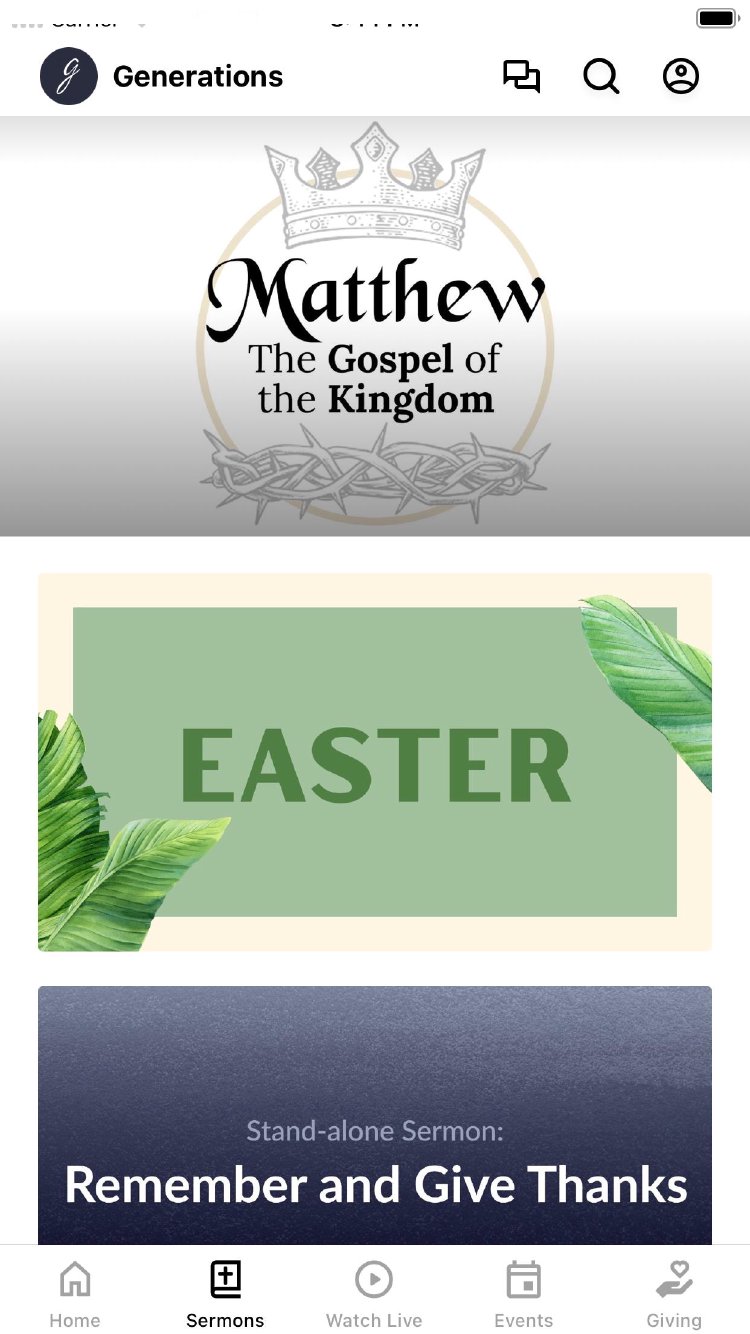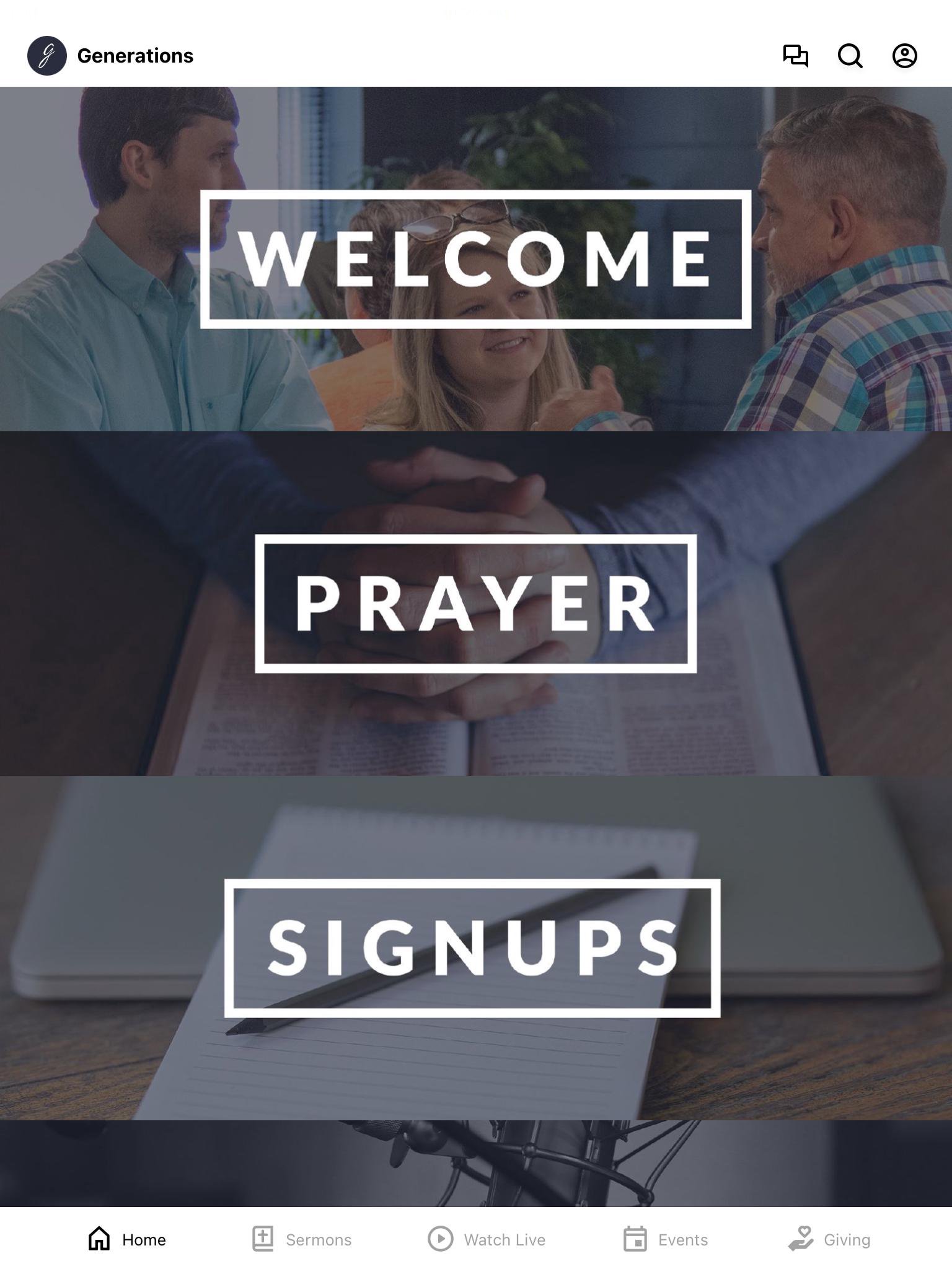 Connect with the family of believers at Generations Norcross via a variety of resources, including sermons, prayer needs, service opportunities, event information, messaging, and more. Features: Sermons - Watch the livestream of our Sunday gathering - Listen to past sermons Prayer - Pray for brothers and sisters at Generations - Submit your own prayer requests Community - Sign up to participate in the ministries of the church - Get up-to-date news and event information - Message other church members - Learn how you can meet the needs of our church family and local community Giving - Make one-time gifts - Set up a recurring offering For more information on Generations Norcross, please visit: www.generationsnorcross.com