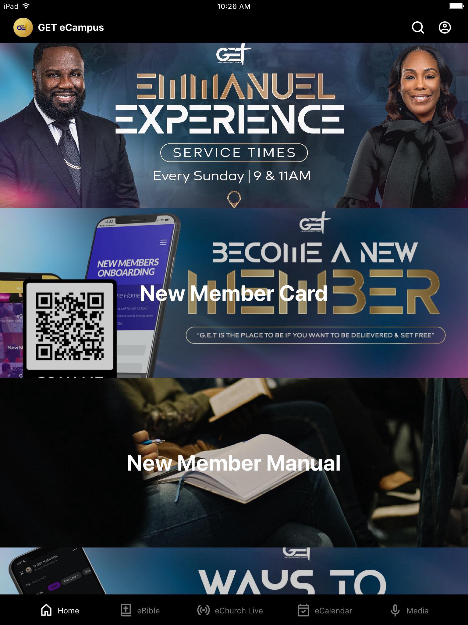 Welcome to Greater Emmanuel Temple eCampus, we're are so blessed to have you be connected with the family. -Watch messages from Senior Pastor Michael B. Golden Jr. -Get the latest news and updates from G.E.T Anchors -Request prayer, submit questions and much more through the contact card -Tune in for our Sunday eChurch Service via Live Stream About G.E.T. eCampus Greater Emmanuel Temple COGIC's eCampus was created so our family, friends, and partners will be able to share the Emmanuel Experience even when you can not make it to the Temple.