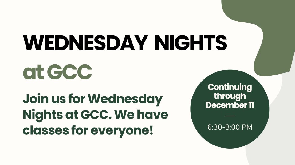 Join us for Wednesday Nights at GCC. We have classes for everyone from young to old. For more information, email admin@glendalechristian.org, or call 417-881-7614.