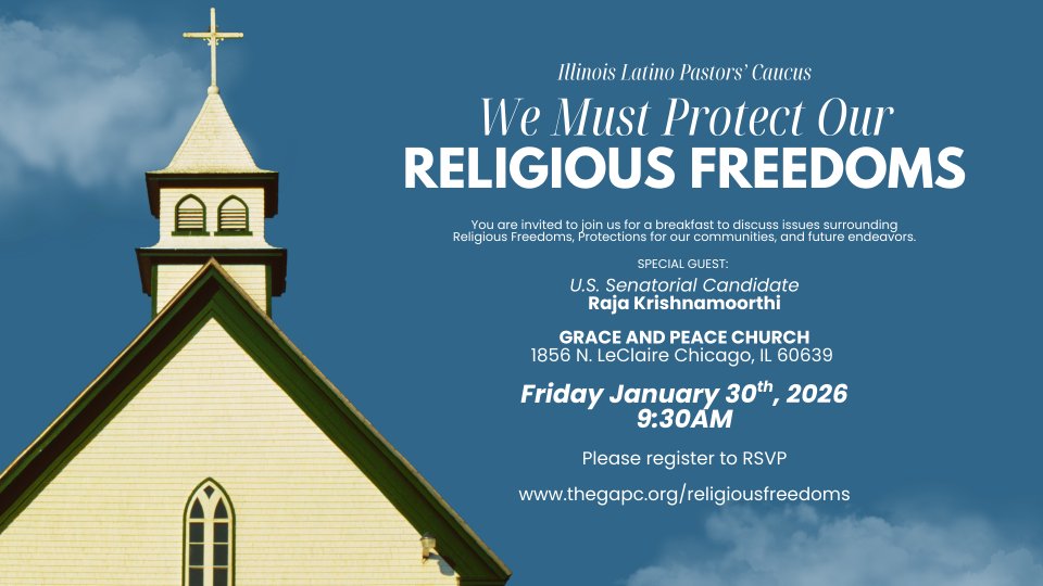 Nos honra dar la bienvenida a Raja Krishnamoorthi, candidato al Senado de los Estados Unidos, como nuestro invitado especial. Él se unirá a nosotros para una conversación abierta y respetuosa sobre la libertad religiosa, las políticas públicas y cómo las decisiones gubernamentales impactan directamente a nuestras congregaciones y vecindarios.