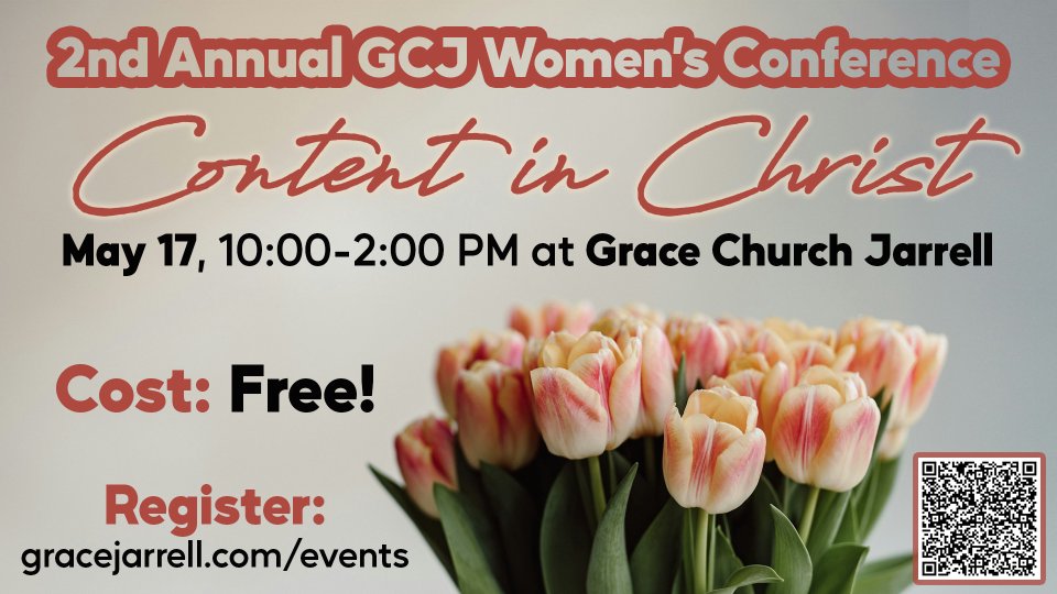 All ladies ages 9 to 99 are invited to join us for our 2nd Annual Women's Conference. Our theme is "Content in Christ". It will take place at Grace Church Jarrell and there will be biblical teaching on Philippians 4:11-13, lunch, and some great interaction. Cost is FREE, but please register to help our planning! Unfortunately, childcare will not be provided.