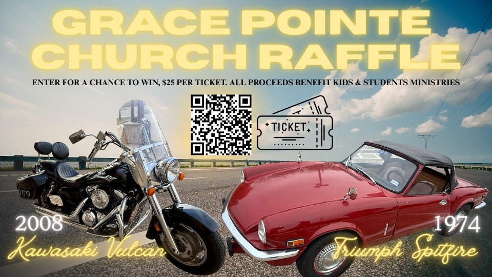 Grace Pointe Church has been blessed with a 1974 Triumph Spitfire and a 2008 Kawasaki Vulcan. These thrilling prizes have been donated for the purpose of raising money for the kids and youth ministries at GPC. We are excited to raffle these items off separately at $25 per ticket. The two winners will be announced the Sunday following the purchase of 1,000 raffle tickets.