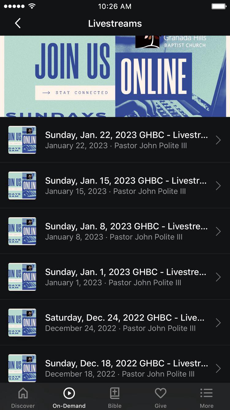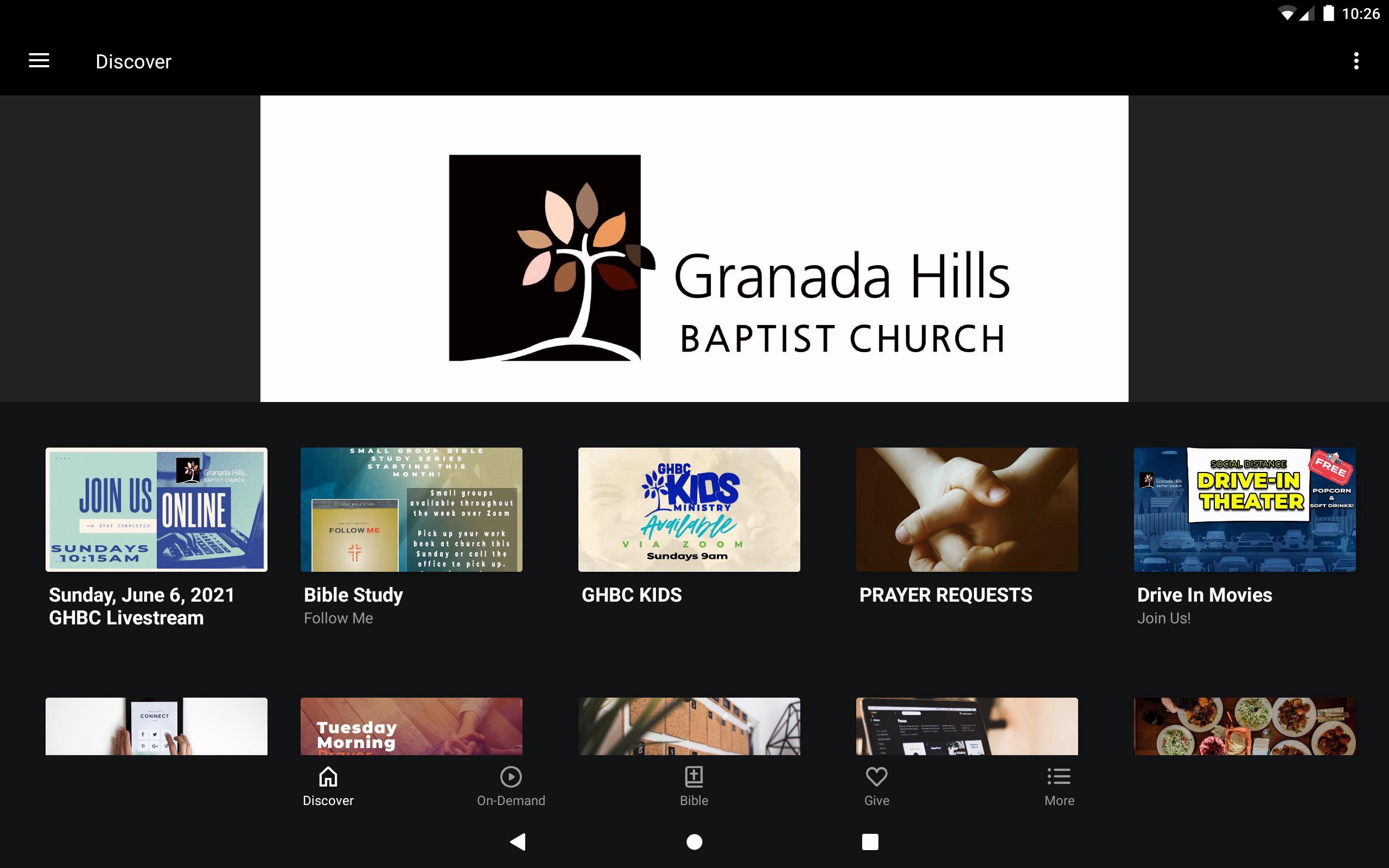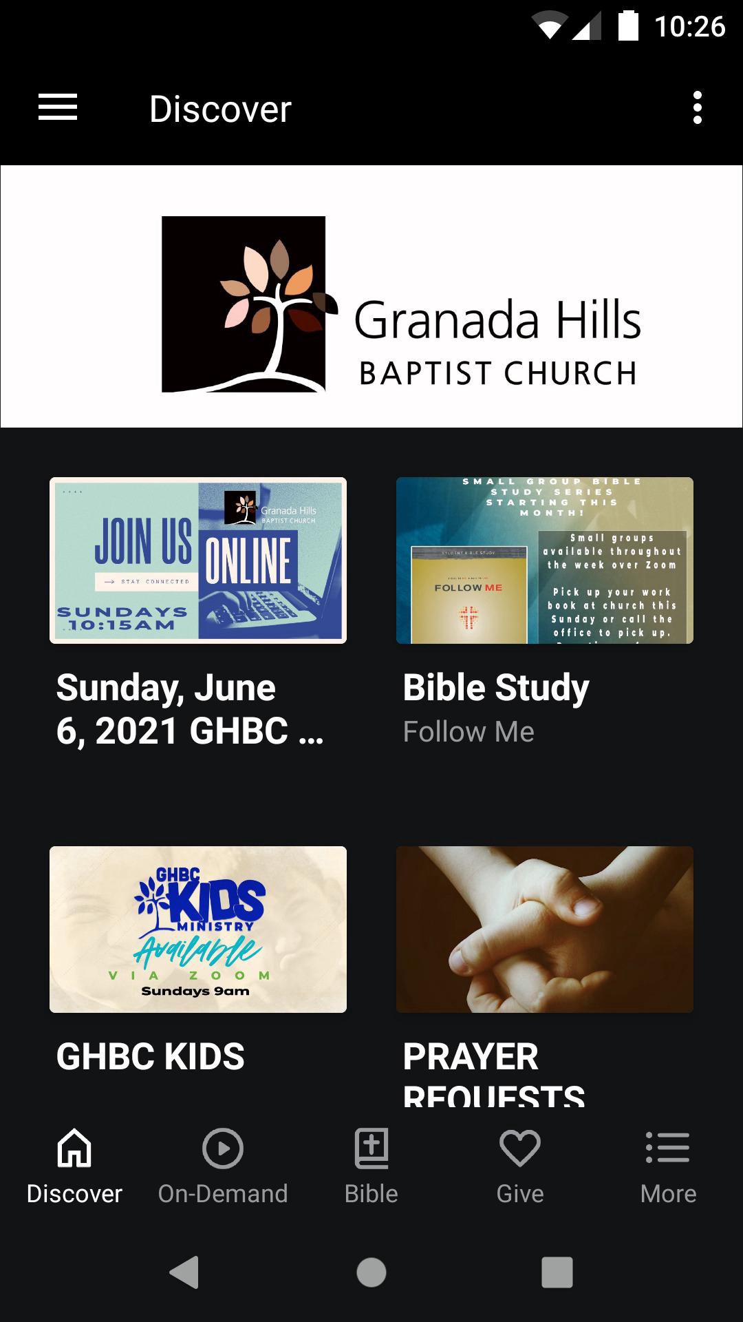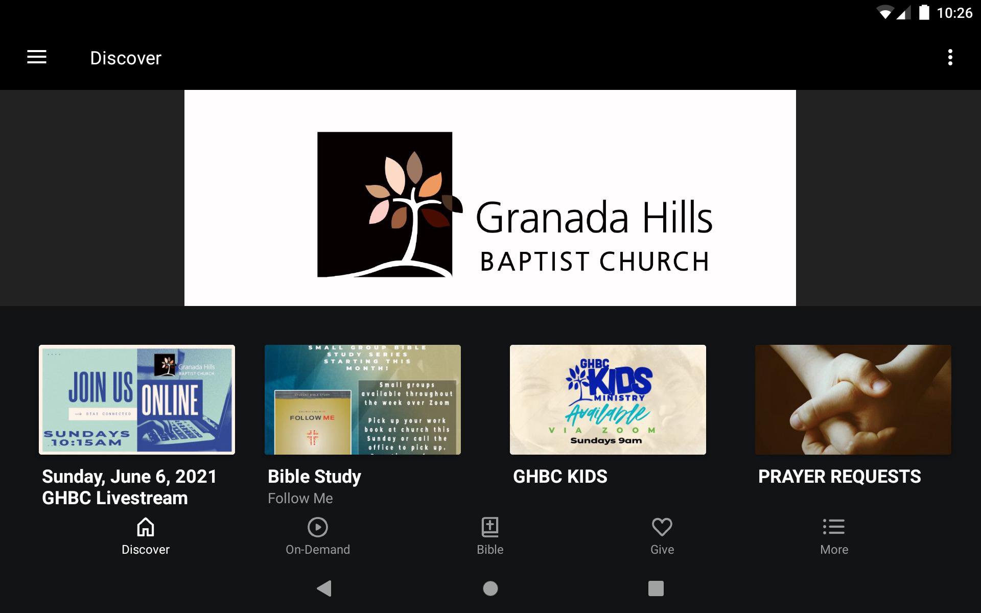 You can use the app to watch or listen to the latest messages, be updated on the upcoming events, give online, or engage with the church. For more information about our church, visit granadahillsbaptist.org