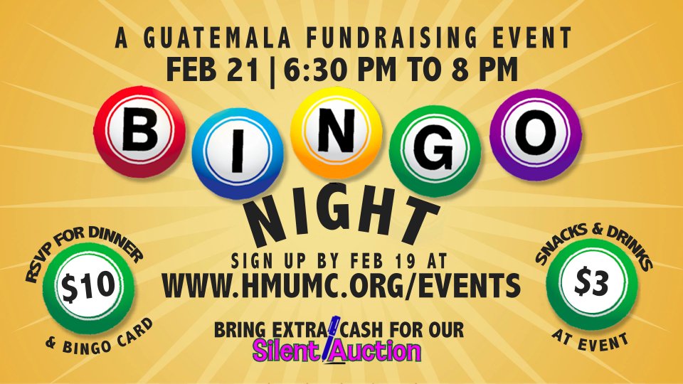 Our Guatemala Missions team is hosting a fun night of bingo and dinner, and EVERYONE is invited! The cost of the event is $10 per person which includes a BBQ sandwich, bag of chips, water, and one bingo card. At the event, additional food items and drinks will be available for $3 per item, and each item includes an extra bingo card. We’ll play as many rounds of bingo as we can fit into our time and awesome PRIZES will be awarded! We will also have a fun silent auction during the event, so please bring a check or some extra cash to help support our team. All funds raised at this event will go towards travel expenses for our Student Ministry Team that will be traveling to Guatemala during their Spring Break (March 29th-April 4). Please sign up online by February 19th so that we can plan seating and dinner. Space is limited so sign up now!