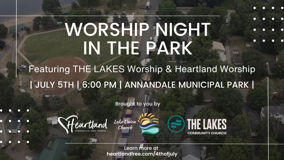 Join us on July 5th as we participate in an evening of worship sponsored by local area churches. We hope you will join us 4th of July weekend for this exciting time of praise in the park featuring our Heartland Worship Team!