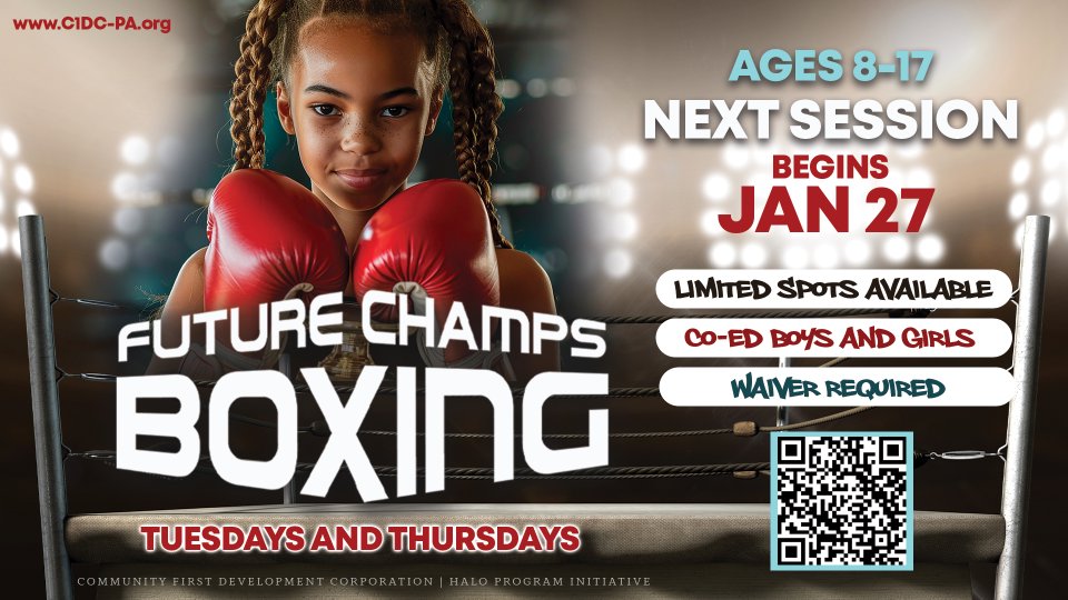 We are building champions in character, first - both inside - and outside the ring. Program runs Tuesdays and Thursdays and parent's must register children in advance. Boxing is held at an off-site location in Pottstown.