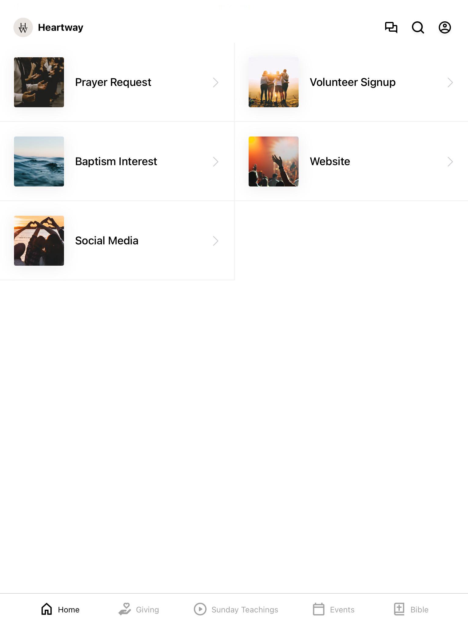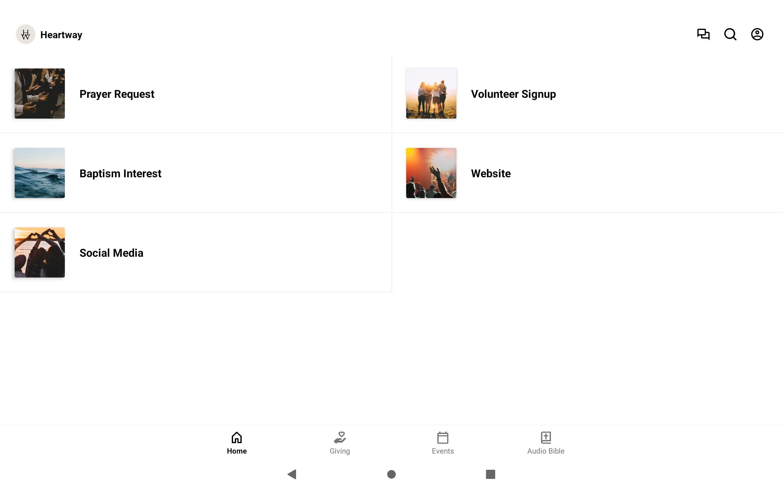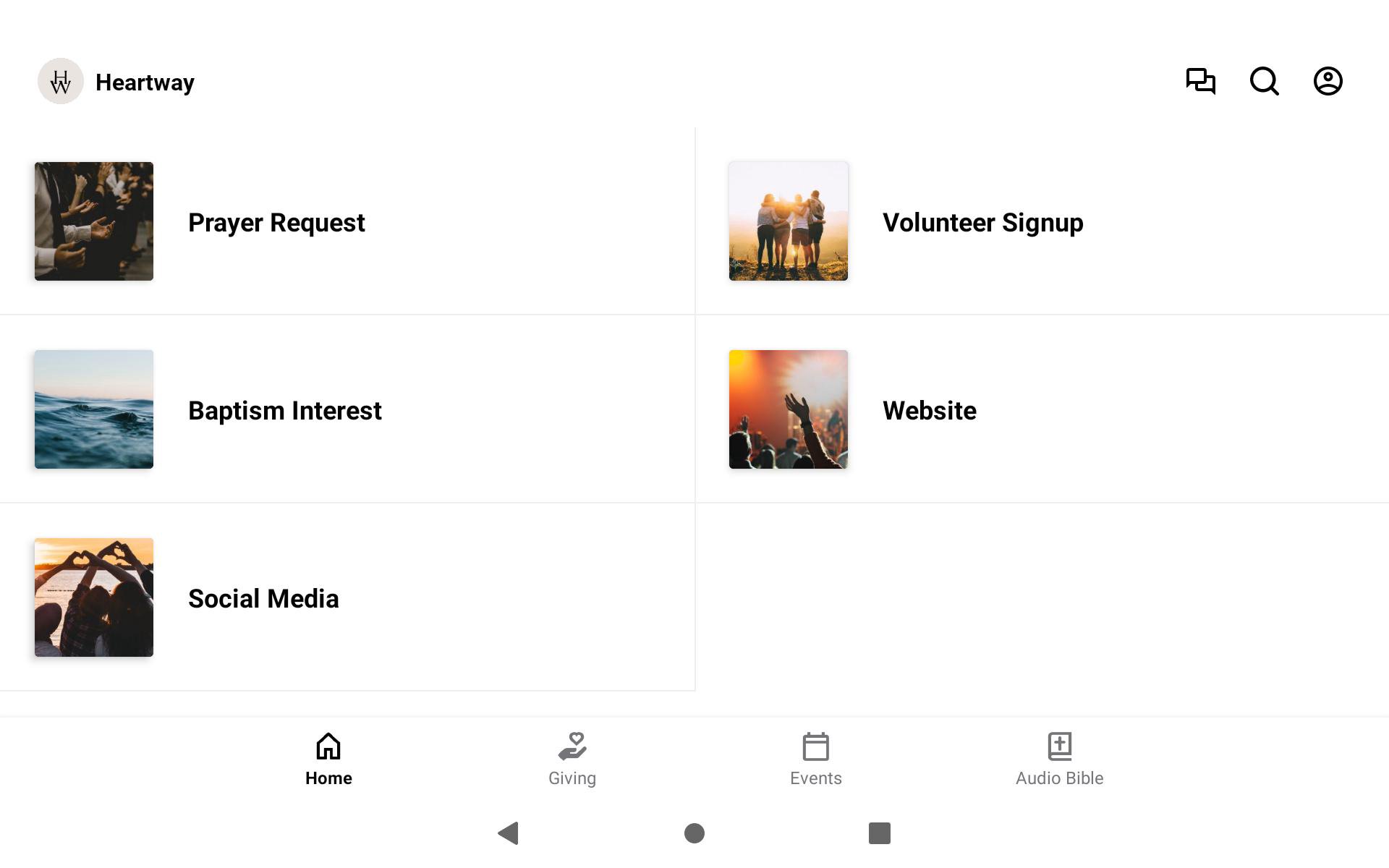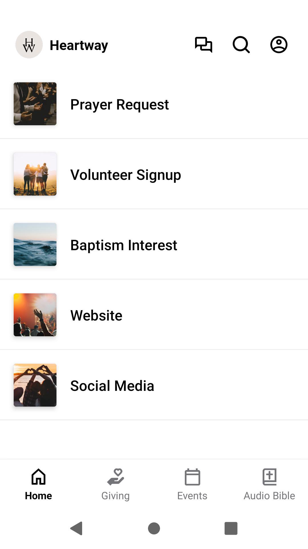The Heartway app has everything you need: in this app you can give/donate to the church through Subsplash Giving, listen to the Audio Bible, find our upcoming events, connect to our website and social media, request prayer, sign up for Baptism and sign up to volunteer.