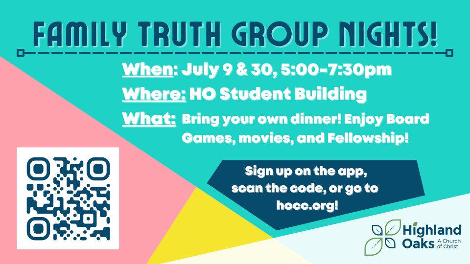 Come and join us for "Family Truth Group Nights" this summer! These nights will be a time of fun with board games, movies, and fellowship. Bring your own dinner and favorite game and meet us up at the Student Building for some fun, family-oriented evenings. HO Kids, Students, parents, and volunteers are encouraged to come. Please use the link below to let us know if you'll be able to come! We look forward to seeing you there!
