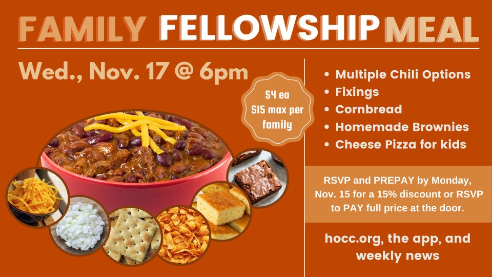 With Covid precautions still on our radar, the decision has been made to hold off one more year from our chili cookoff. However, fear not! Chad and his team will be preparing several different chilis to sample, along with cornbread and all the fixings that make a bowl of chili great. Brownies for dessert and pizza for the kiddos. $4ea/$15 family max at the door. However, to help Chad and his team prepare, you are encouraged to RSVP on the app/web by Monday, November 15th. You can RSVP only without paying in advance, or pay ahead and get a 15% discount!