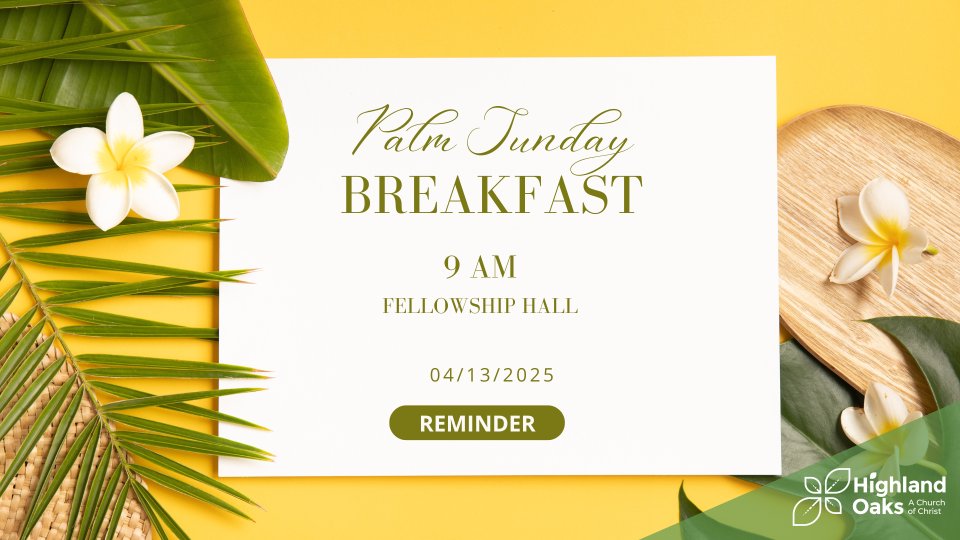 In lieu of Bible Classes, join us Sunday morning April 13th at 9am in the Fellowship Hall for a complimentary Palm Sunday Breakfast. Breakfast Tacos will be served. Afterwards, we will move to the Worship Center at 10am for Service.