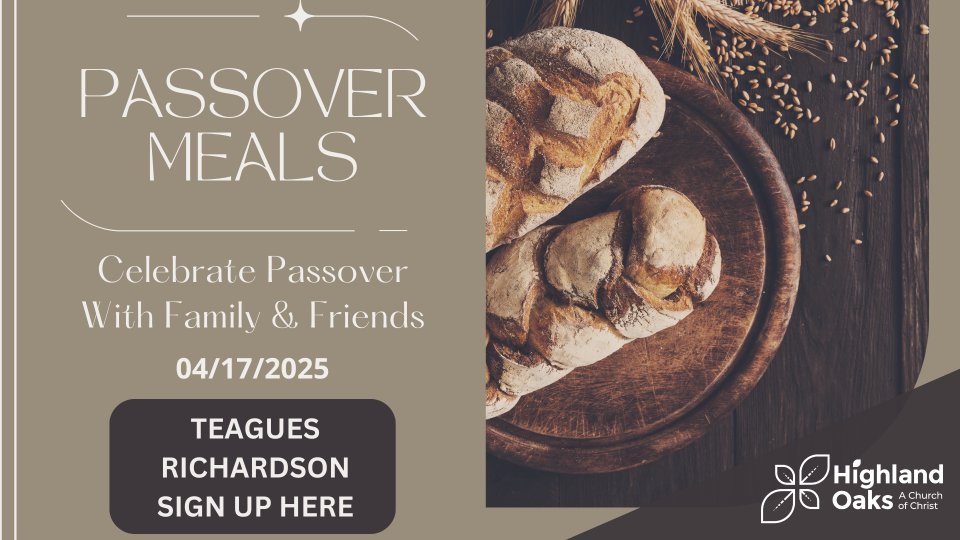 Join the Teagues on Thursday, April 17th for a Passover Celebration Meal beginning at 6:30 pm. Turkey and dressing will be served.