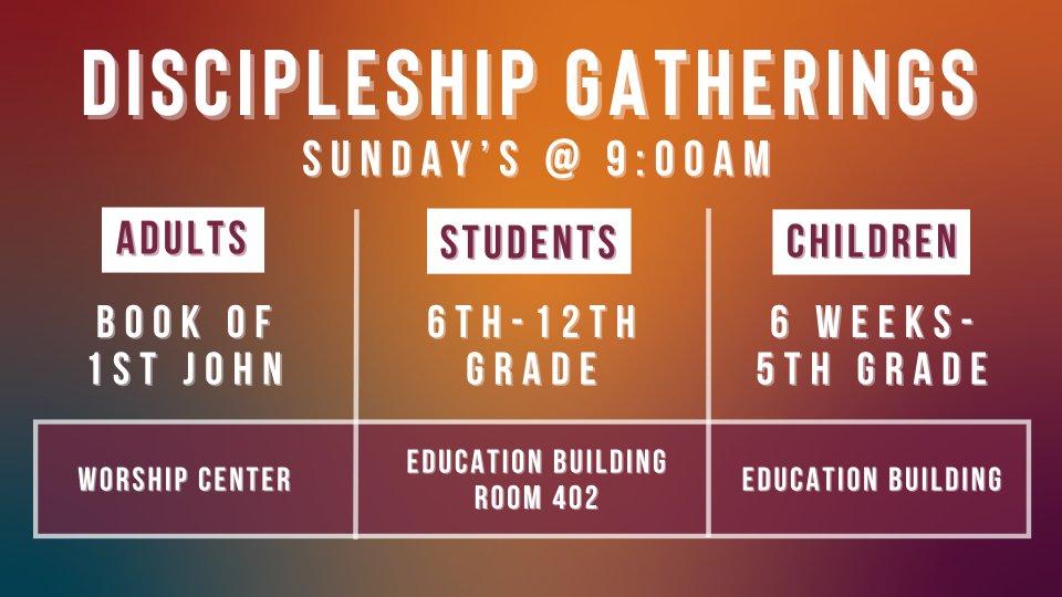 Join us at 9am every Sunday for a chance to grow and connect with our Discipleship Gatherings. Adults will assemble in the Worship Center for a study of 1st John entitled, "Surrender To Love." Teachers: Pat Bills and Chad Higgins Students (6th - 12th grade) will meet in room 406 of the Education Building to talk about "Who Is God? Meeting the God of the 1st Testament." Teacher: Josh Tracy Children (6 weeks - 5th grade) will gather in the Education Building to learn about faith development specific to each age range. Teachers: Various