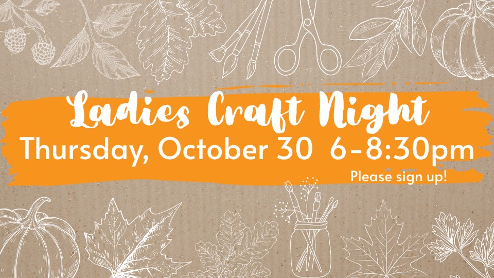 Ladies and youth-aged girls are invited for a night of crafting, socializing, and fun! We will begin in the gym at 6 pm, with a light meal. Sign up on the attendance pad or on the sign-up sheets in the church. For more info, see Nancy Huggins or Sarah Howard.
