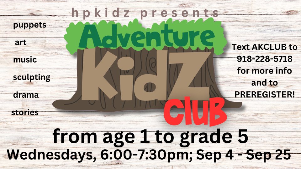 There will be puppets, stories, games, fun, music, sculpting, drama and drawing! If your kids enjoyed VBS, they will love Adventure Kidz Club! Come each week to get the collectable Bible Adventure trading cards! For more info text AKCLUB to 918-228-5718. Register below!!