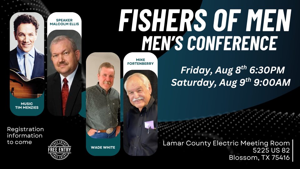 This FREE event will be Friday, August 8 at 6:30 pm & Saturday, August 9 at 9 am at Lamar County Electric Meeting Room, 5225 US HWY 82 E, Blossom, TX 75416. Speakers include Malcom Ellis, Wade White, & Mike Fortenberry, Music & Worship by Tim Menzies.