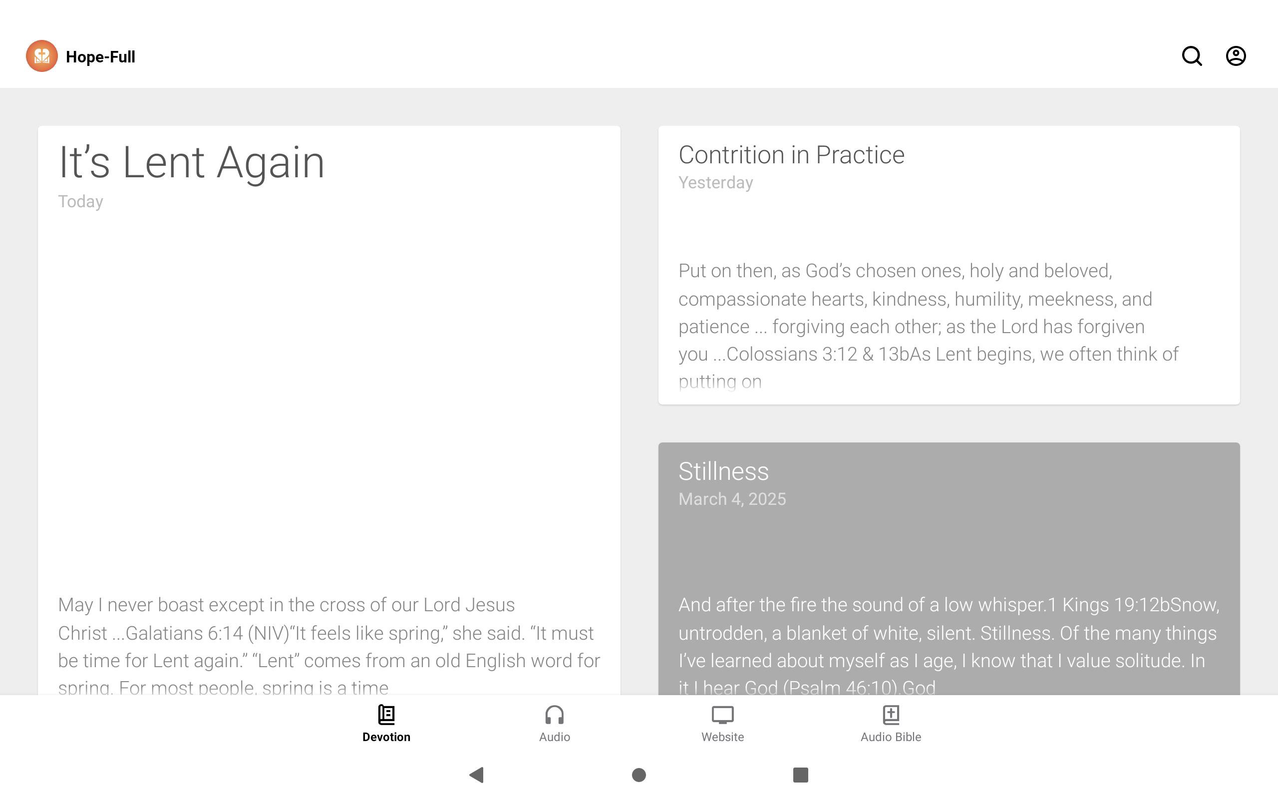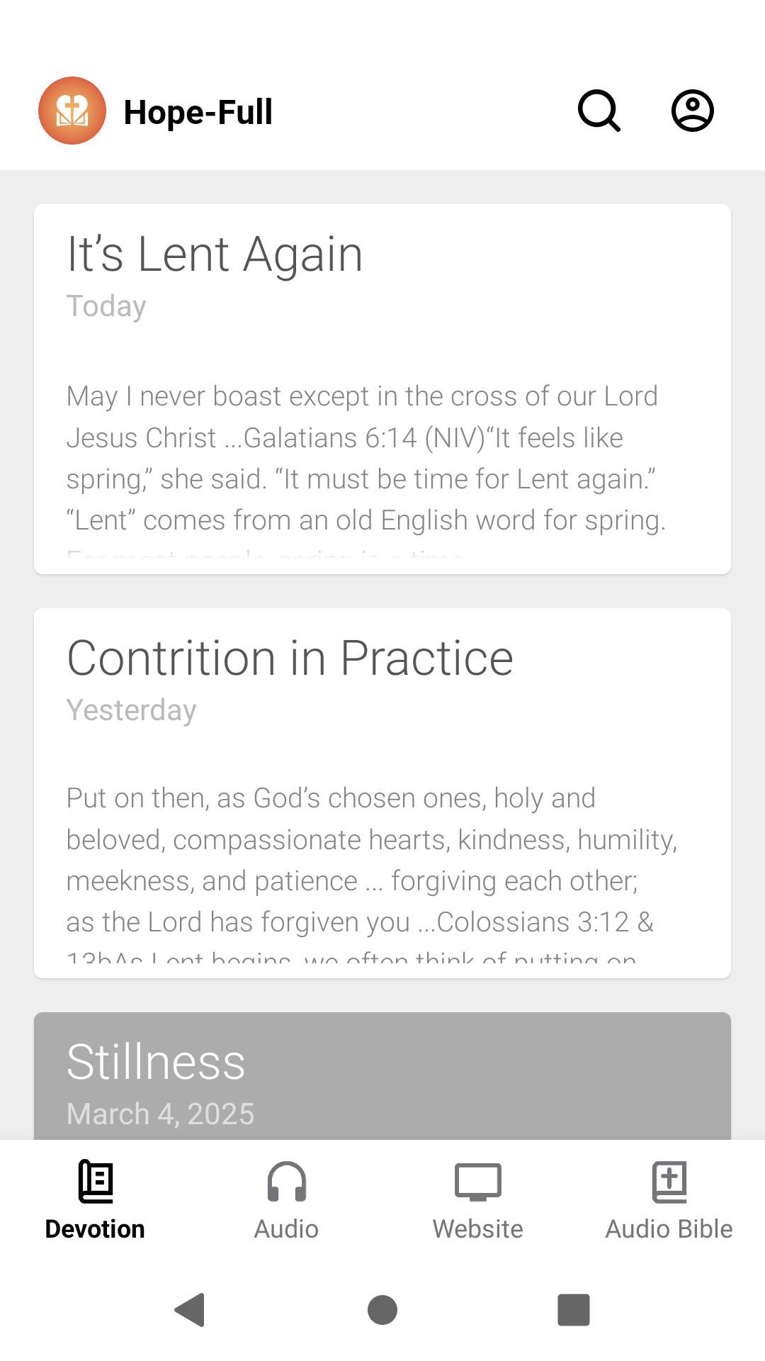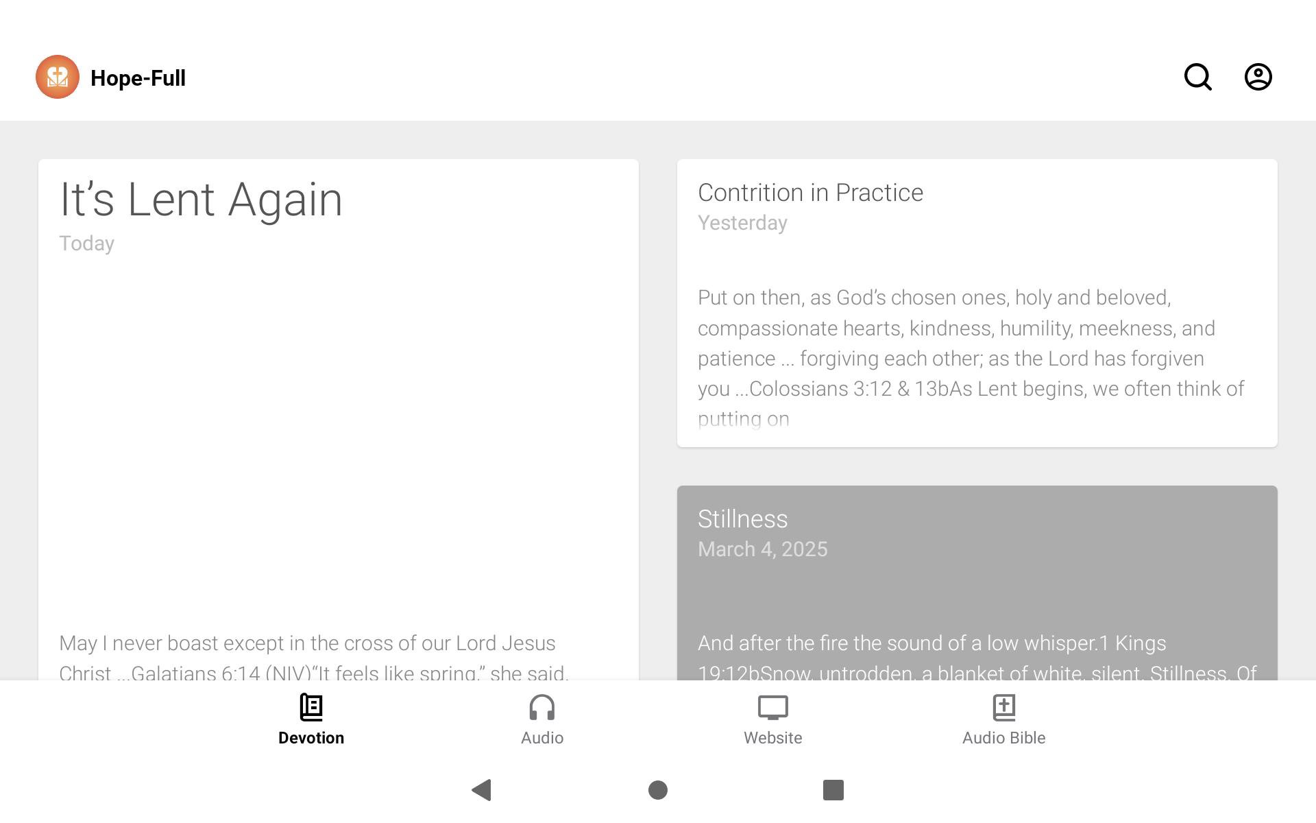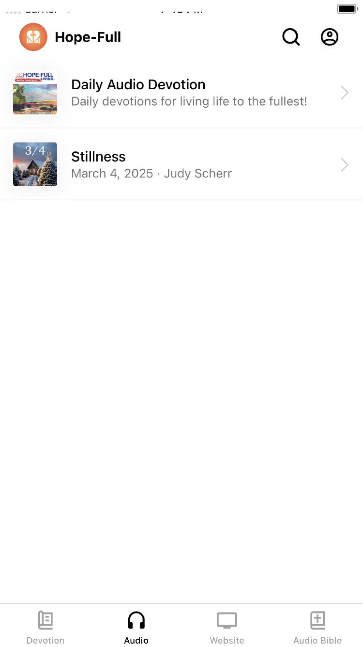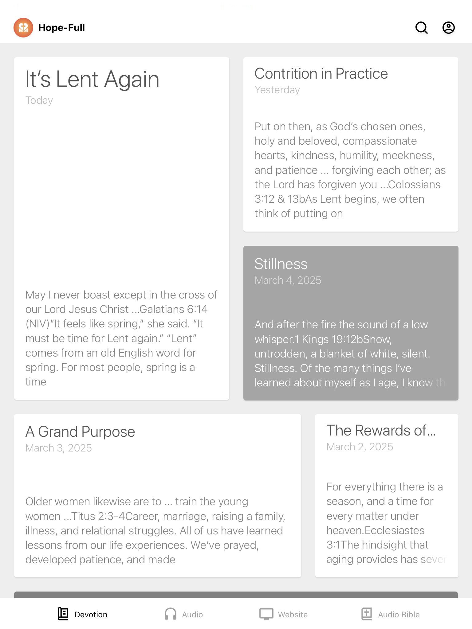 Hope-Full Living is a daily devotion for living life to the fullest. Each devotion is written for seniors by seniors. This app will give you access to the Hope-Full Living daily devotion as well as past devotions. Each devotion includes a Bible verse, meditation, prayer, suggested Bible readings, and an action you can take to reinforce the message of the devotion. With the Hope-Full Living app, you can also: - Share your favorite devotion through Facebook or email - Download devotions for offline reading
