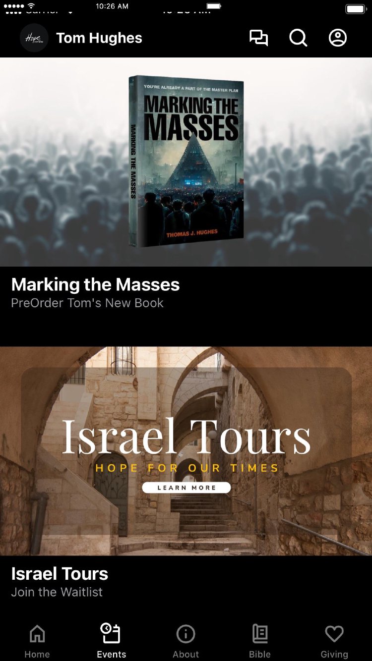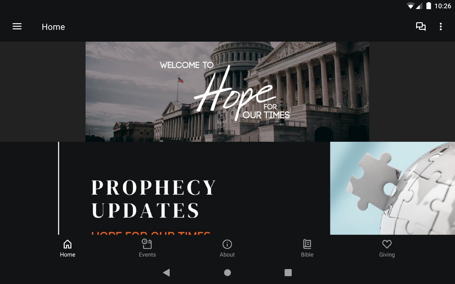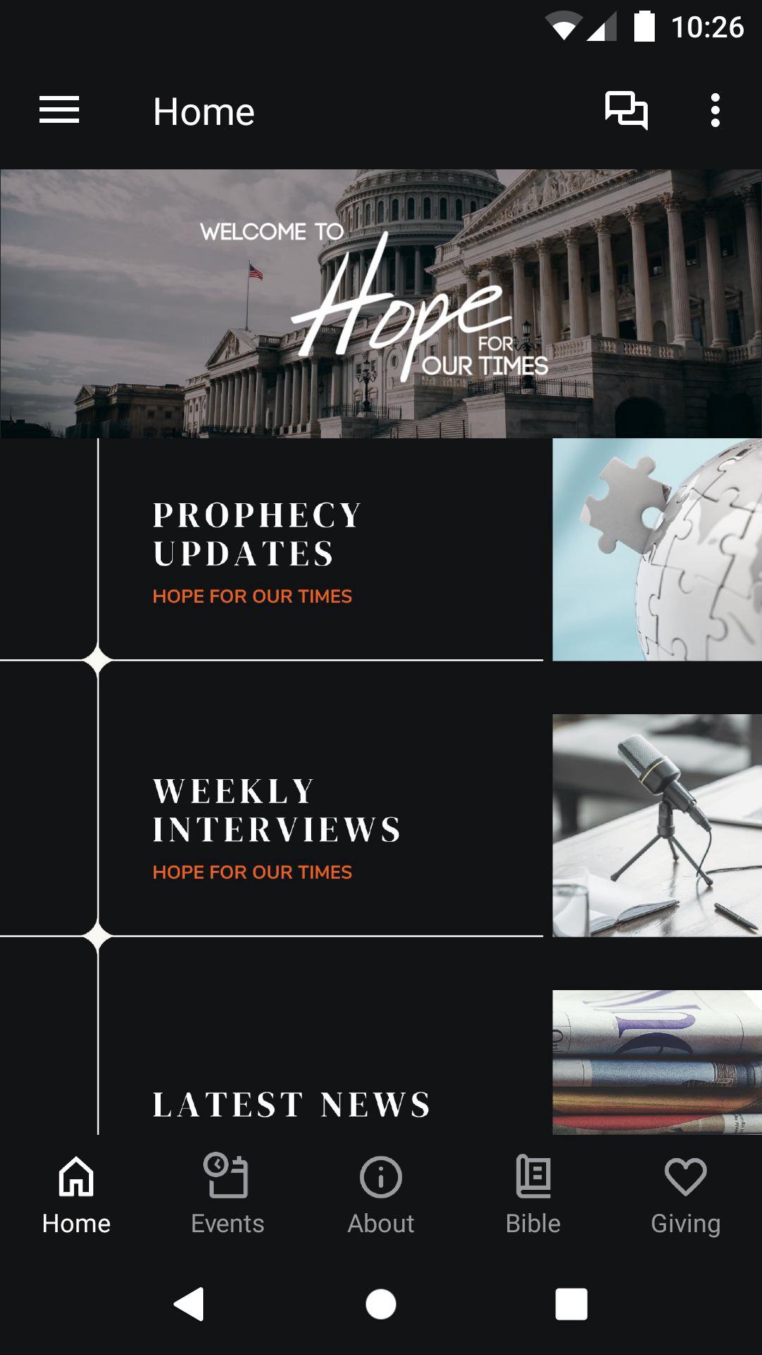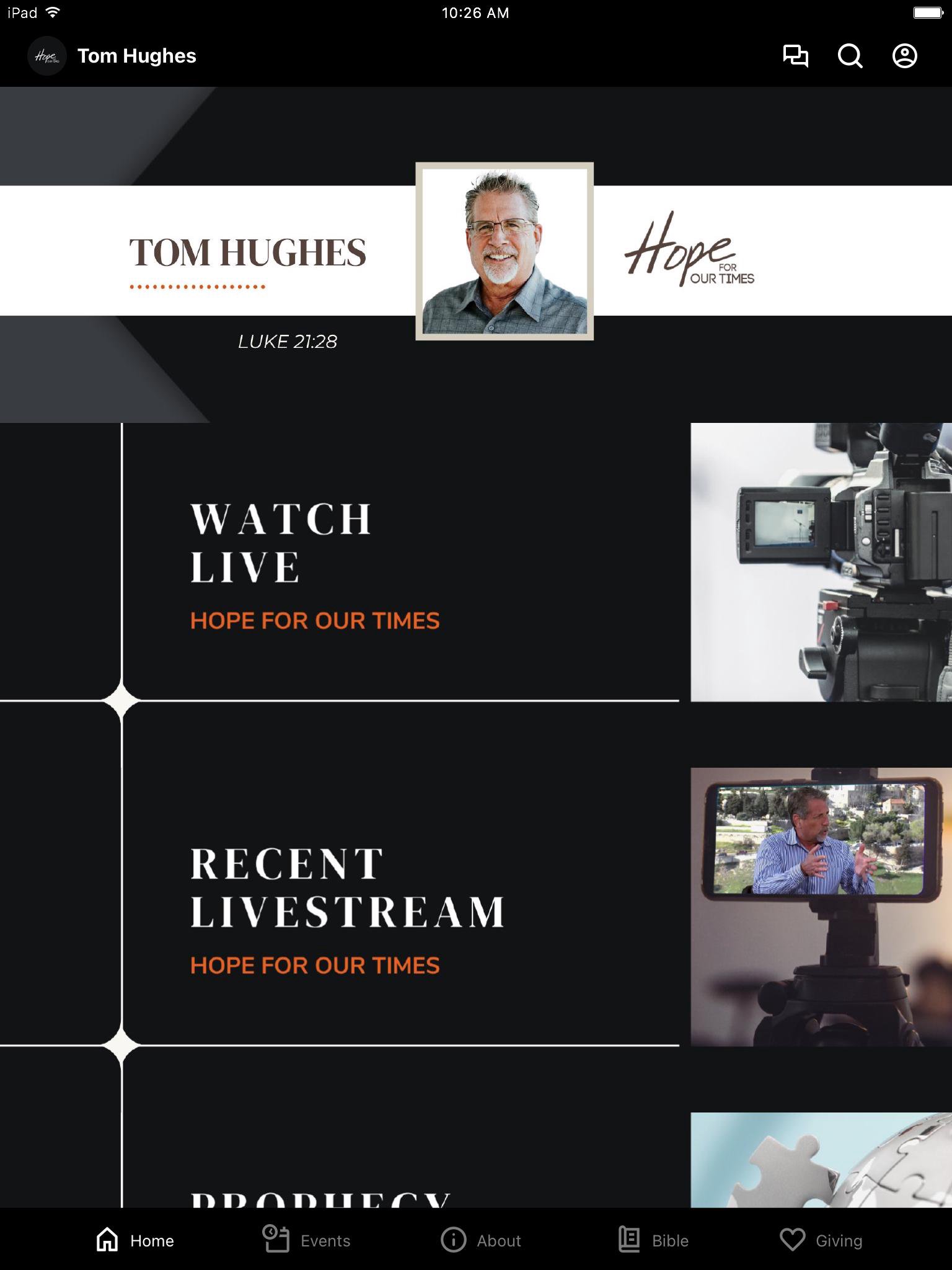 Welcome to Hope for our Times, a ministry led by Tom Hughes which focuses on the prophecies of the Bible concerning end times events. Our desire is to share the importance of having a saving relationship with Jesus Christ and how to live in these Last Days with the hope that can only be found in Him. The Hope for our Times App is the easiest way to stay connected: - Watch Live and share to your TV or devices - Listen to latest teachings - See weekly interviews - Stay updated with curated news - Find information on latest events and conferences