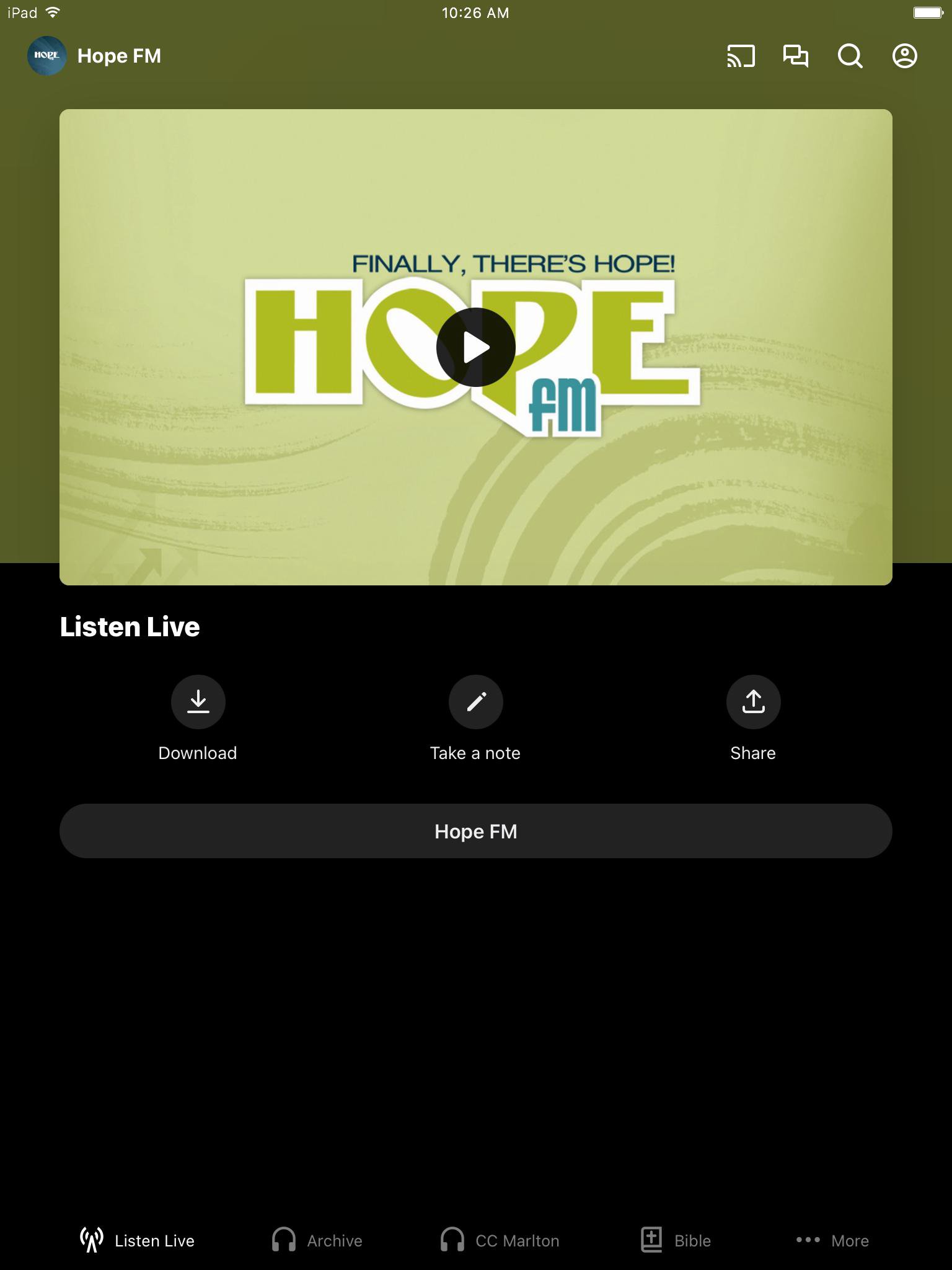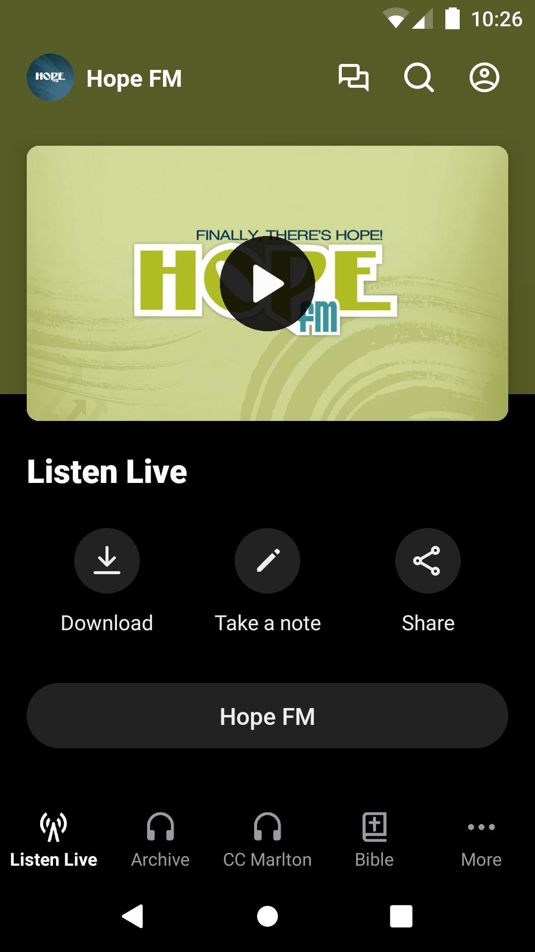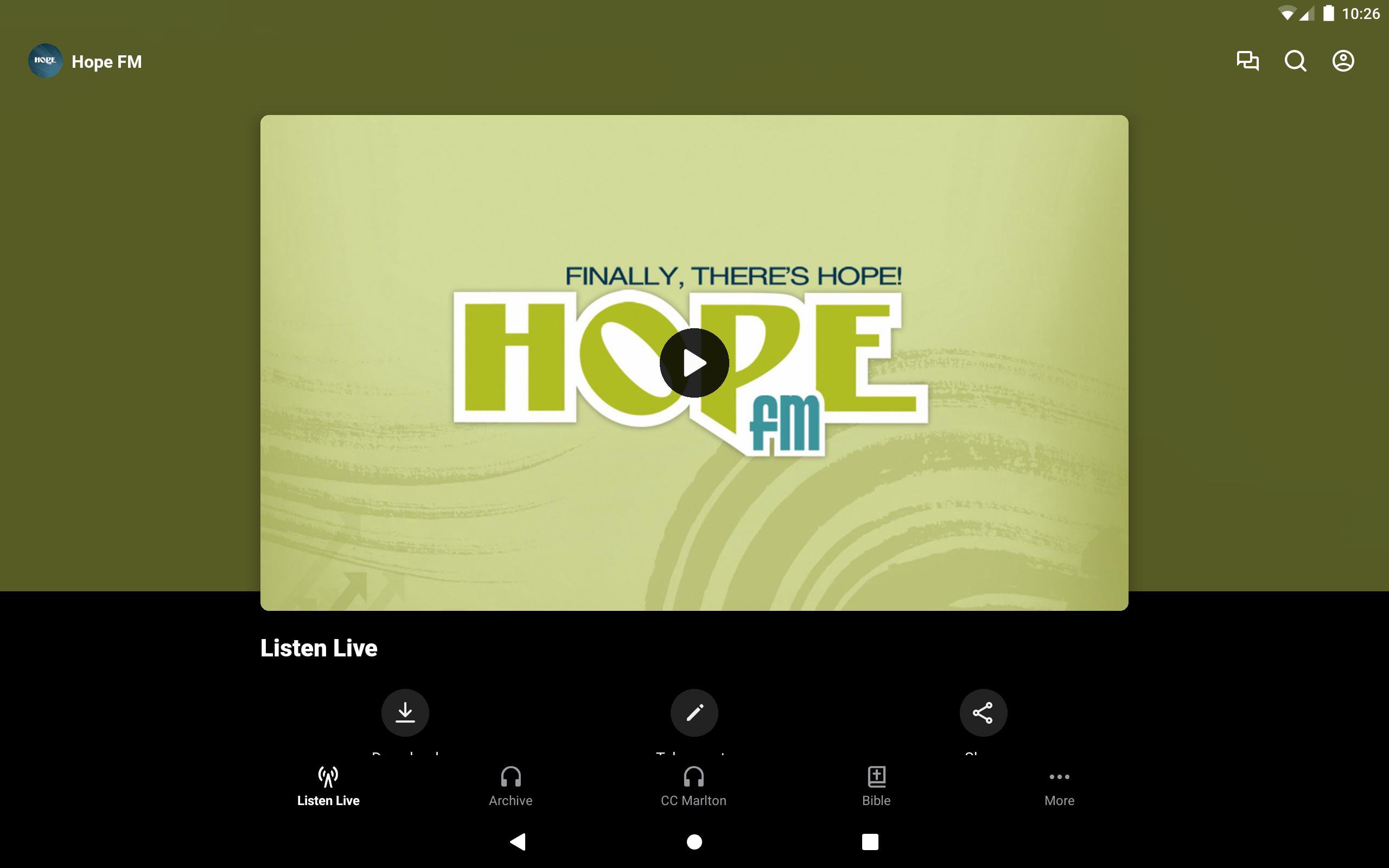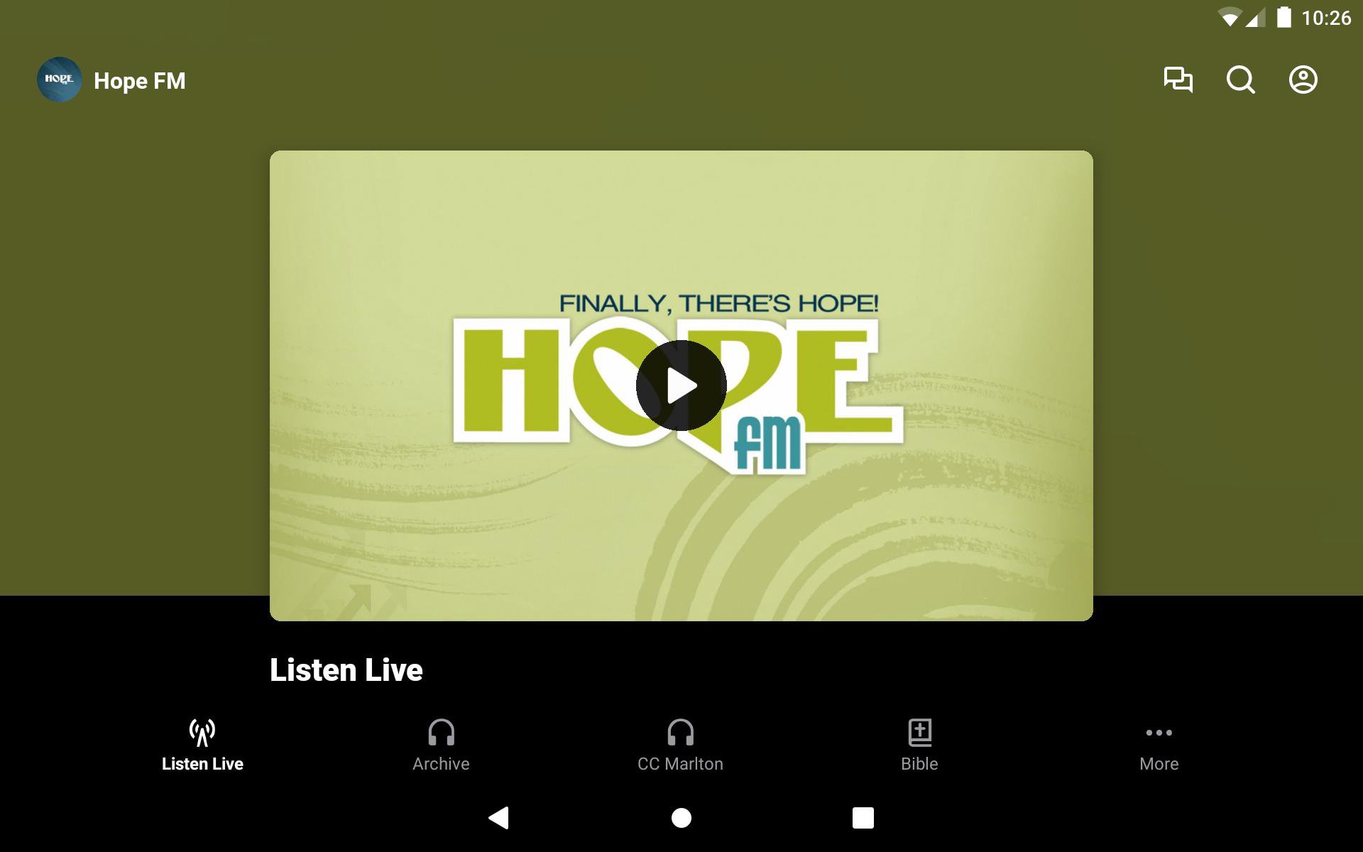 Welcome to the official Hope FM radio app! The Hope FM radio station app provides access to live radio and program archives. Listen live or on your own schedule with access to programs on the Hope FM radio network. For more information about Hope FM, please visit: http://www.hopefm.net/ The Hope FM app was developed using the Subsplash App Platform.