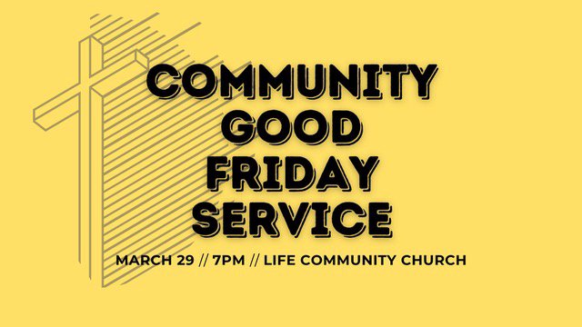Join with the Body of Christ in Wells County for this year's community Good Friday service. This year's service will take place at Life Community Church in Bluffton, and we encourage you and your family to join us as we gather to reflect on and remember the sacrifice of Christ on the cross.