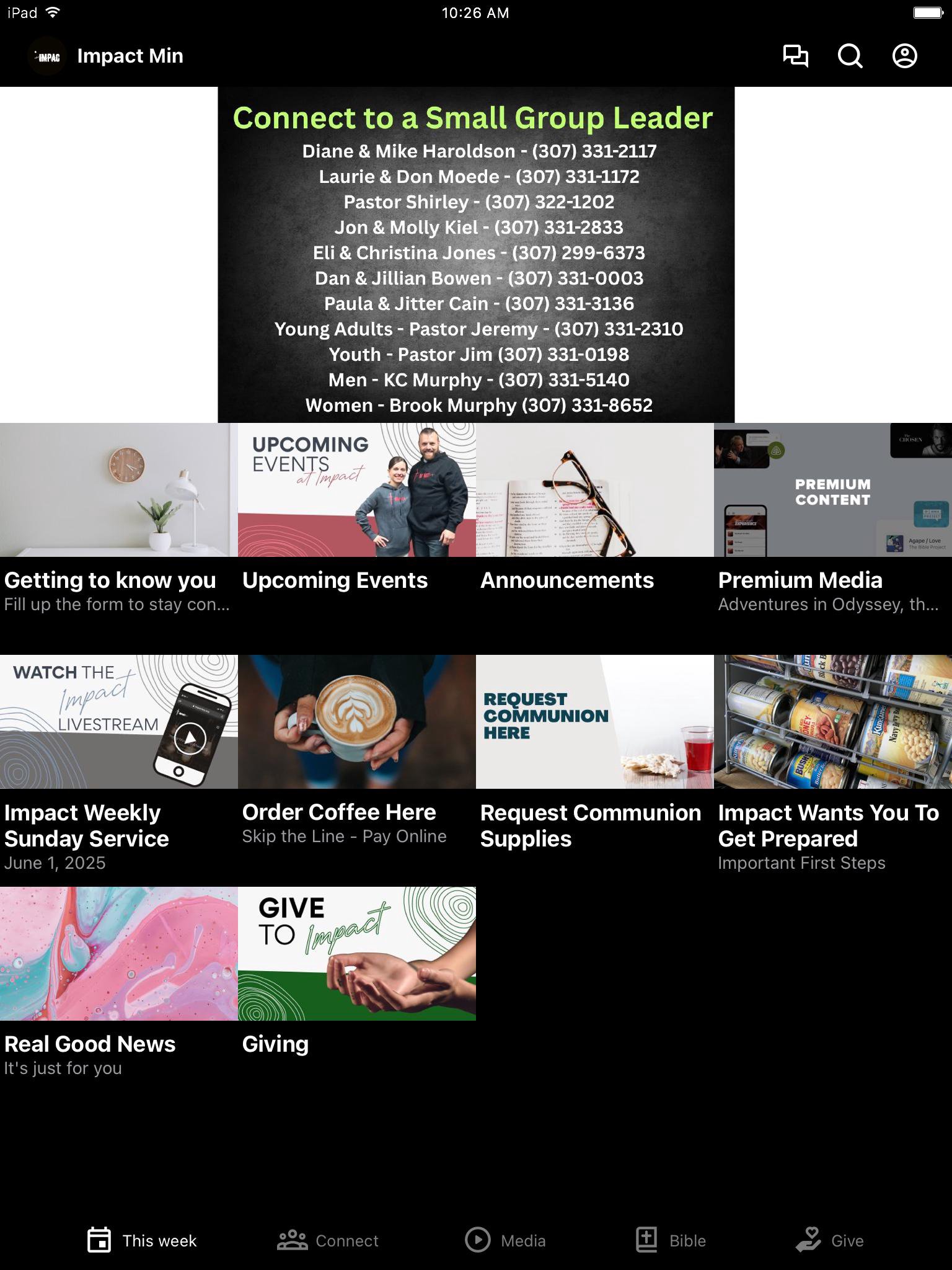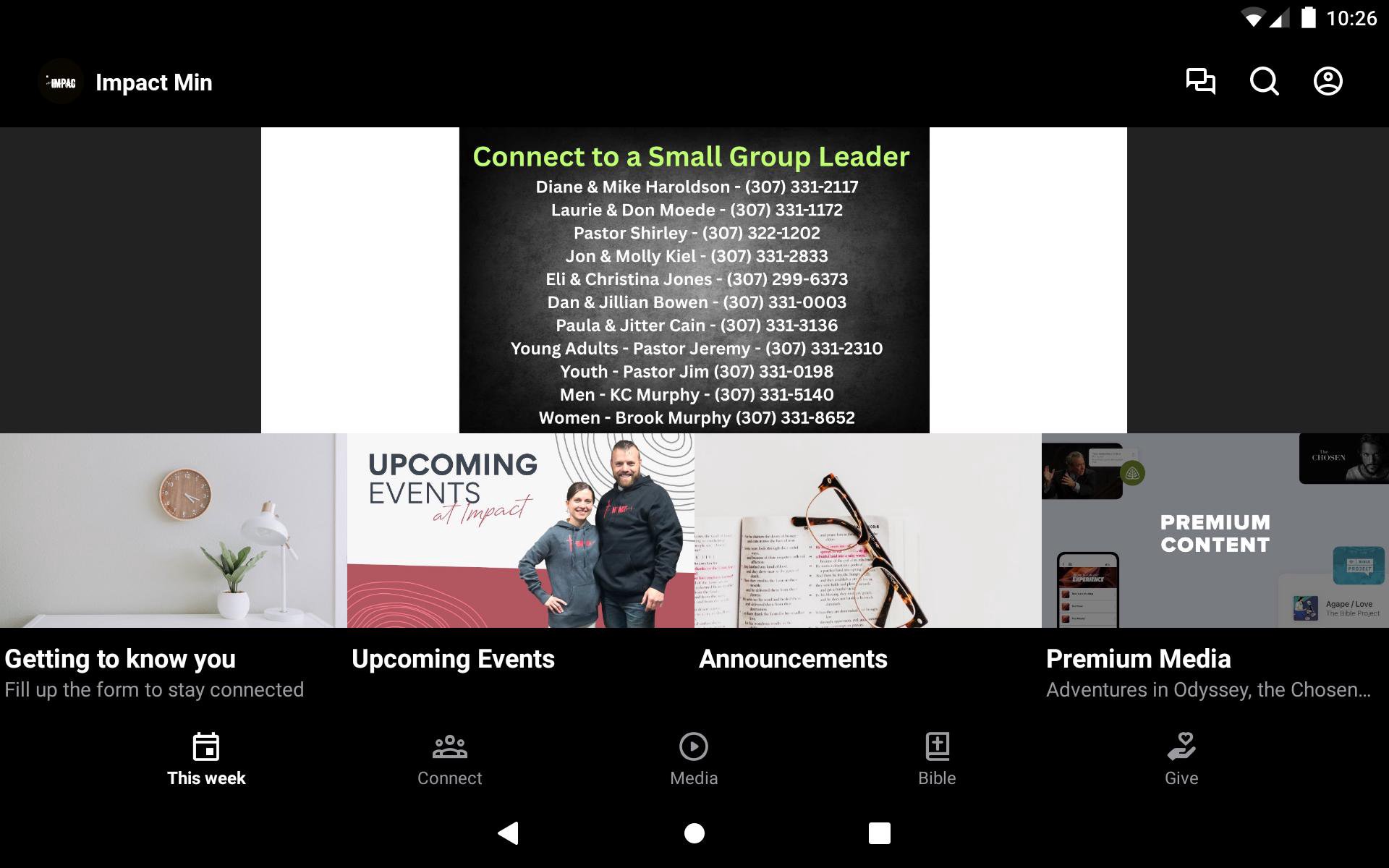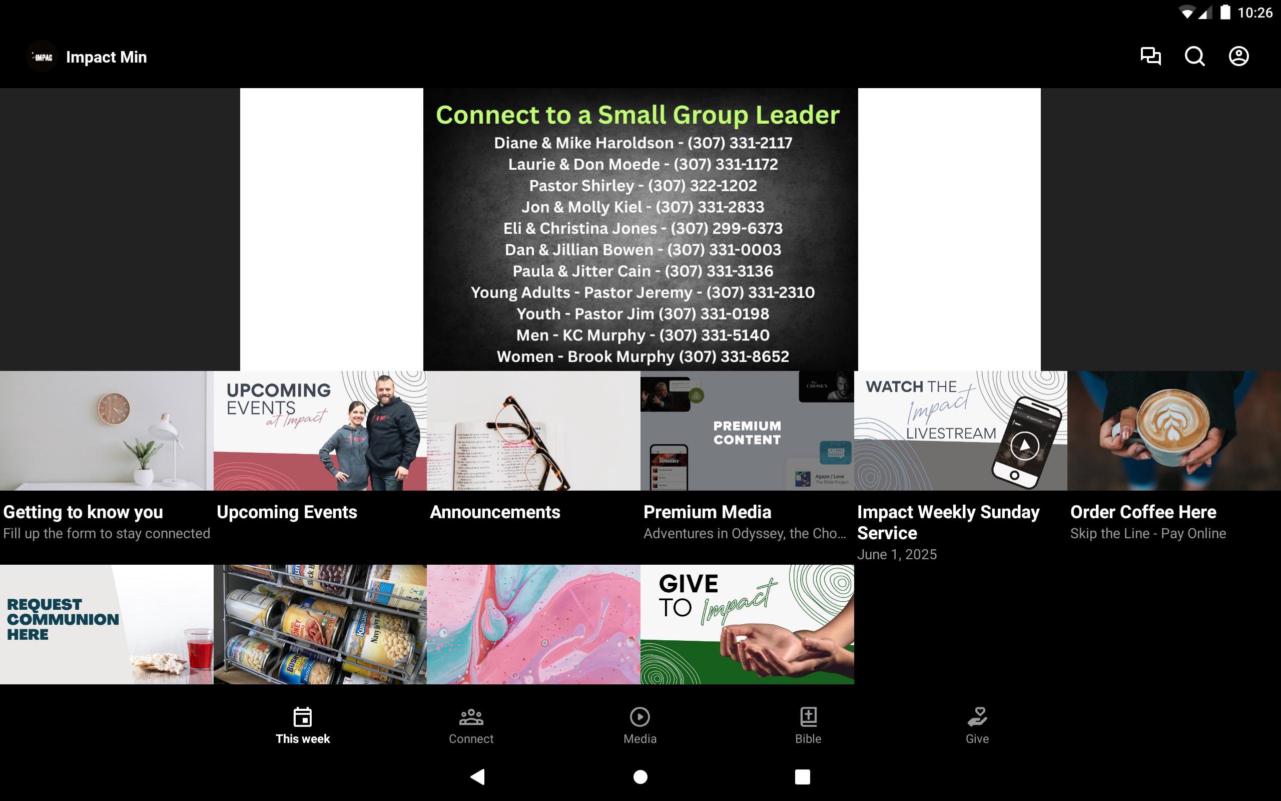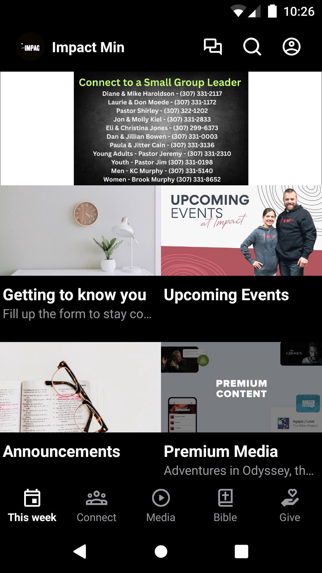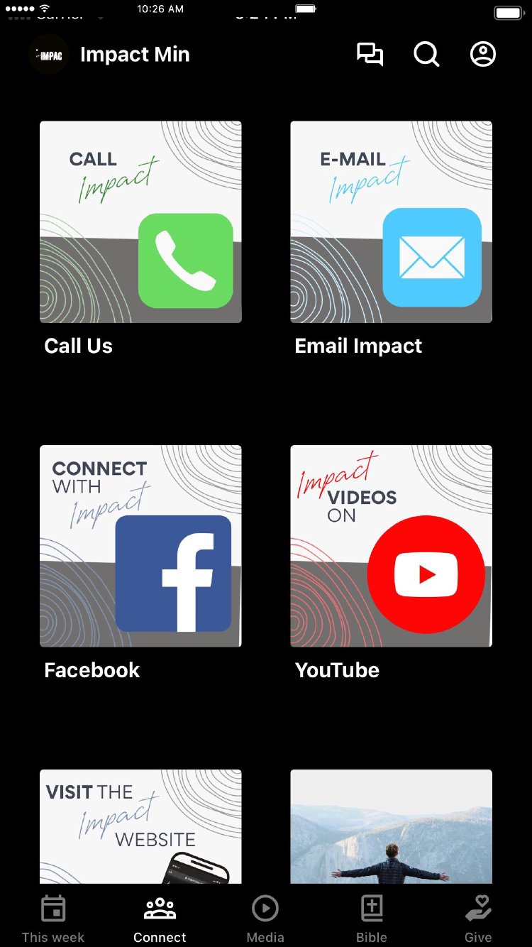 This app will help you stay connected with the day-to-day life of our church. With this app you can: watch or listen to past messages; stay up to date with notifications specific to you and your needs; find out what is happening at Impact this week; keep up with upcoming events; share your favorite messages via Twitter, Facebook, or email; and download messages for offline listening and so much more.