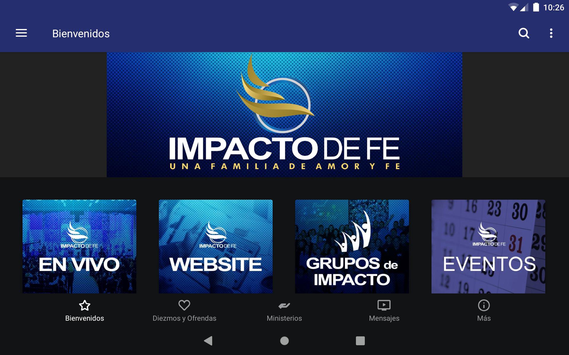 La aplicación oficial de Impacto de Fe es la mejor manera de conectarte con todo lo que sucede en Impacto de Fe. Con la aplicación puedes ver y escuchar servic, ofrendar y diezmar, ver el servicio en vivo, y mucho más! Para más información, visítanos en impactodefe.net The official app of Impacto de Fe is the fastest and easiest way to connect with all things happening at Impacto de Fe. With this app you can watch and listen to sermons, give your tithe and offering, watch sermons live and much more! For more information, visit us online at impactodefe.net Iglesia Impacto de Fe: Una Familia de Amor y Fe. Fundadores Adan Y Martha Aguirre. The Impacto de Fe app was developed with Subsplash App Platform.