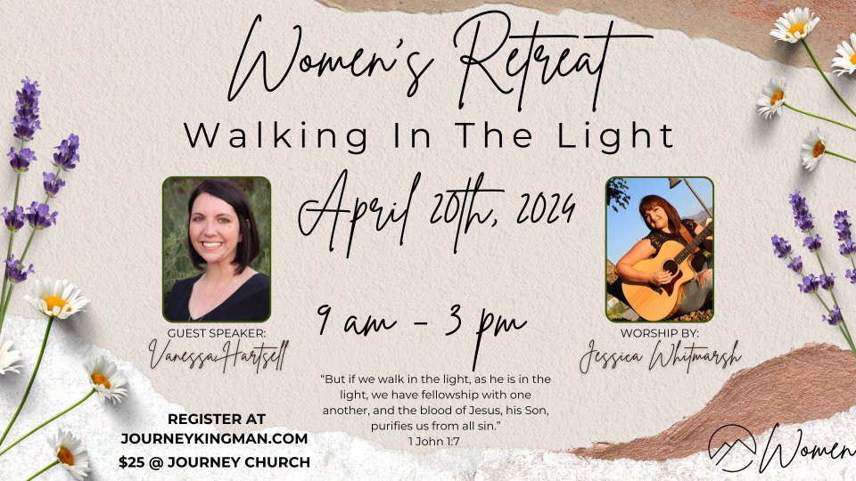 Ladies it’s THAT time again! Time to sign up for our Annual Spring Retreat. Our retreat will be April 20, 2024 from 9am to 3pm. The cost is $25 and you will hear 3 sessions from our speaker Vanessa Hartsell, heartfelt worship with Jessica Whitmarsh, and you will have the opportunity to attend two breakout sessions. Our Theme for the day is going to be “Walking in the Light” taken from 1 John 1:7 it says, “But if we walk in the light, as he is in the light, we have fellowship with one another, and the blood of Jesus his Son cleanses us from all sin.” Ladies be prepared to leave with a changed heart, a closer walk with Jesus, and a renewed hope for tomorrow!