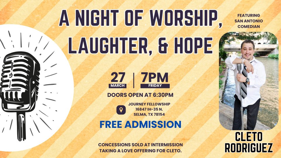 Join us for a Night of Worship by the JF Worship Team, Laughter featuring San Antonio Comedian Cleto Rodriguez, and a message of Hope from Cleto about his relationship with Jesus. Doors open at 6:30pm. Free admission with a Love Offering taken for Cleto. Concessions will be sold at intermission by Journey Students for Summer camp.
