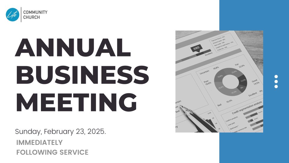 The annual business meeting of Life Community Church. The meeting will begin following the morning service. We will be electing one board member to serve on the church board and taking time to celebrate God's faithfulness during 2024 even as we look forward to 2025.