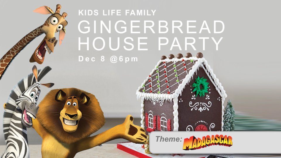 Join us for a fun family evening at our annual KidsLife Gingerbread House Party. All of the essential material for building your Gingerbread House will be provided. Bring your own candy decorations. Our theme this year is Madagascar.