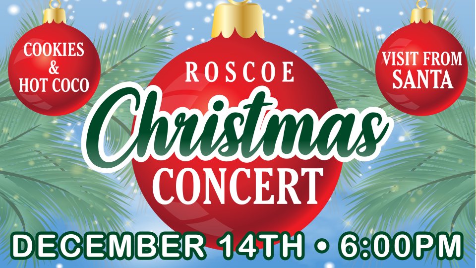 Join us at the annual Roscoe Christmas Concert as we celebrate the season with music, videos, stories, and more. Before the concert begins Hot Cocoa and an opportunity for kids to visit with Santa will be available in the lobby. Come celebrate and experience the miraculous season of Christmas with us. Admission is Free.