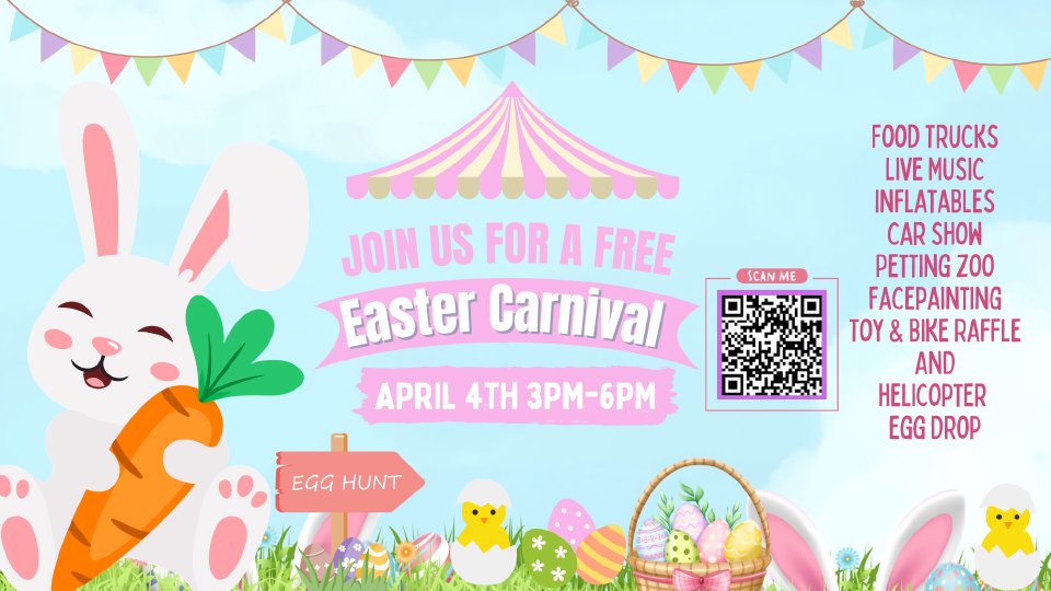 Get ready for an unforgettable Easter celebration! Join us on Saturday, April 4 from 3–6 PM for our exciting Easter Carnival — an afternoon packed with fun for the whole family. Enjoy delicious food trucks, exciting games, a petting zoo, face painting, photos with the Easter Bunny, and the highlight of the day — an incredible helicopter egg drop you won’t want to miss!