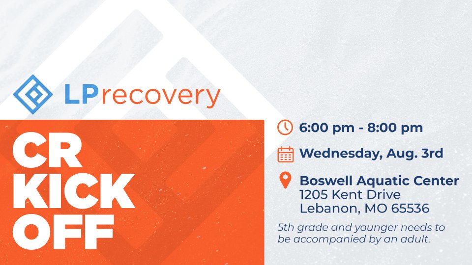 Join us at Boswell Aquatic Center for our Celebrate Recovery kick off. We will meet at 5:30 for dinner and the pool will open at 6:00 pm. This is a FREE event and open to the public. Bring your friends and family! **Children 5th grade and younger will need to be accompanied by an adult For more information please contact Sarah in the office.
