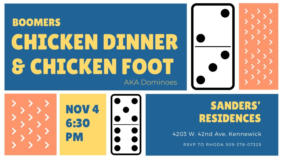 Boomers are invited to the Sanders for chicken dinner and chicken foot (dominoes). Please text an RSVP to Rhoda at 509-378-0732.